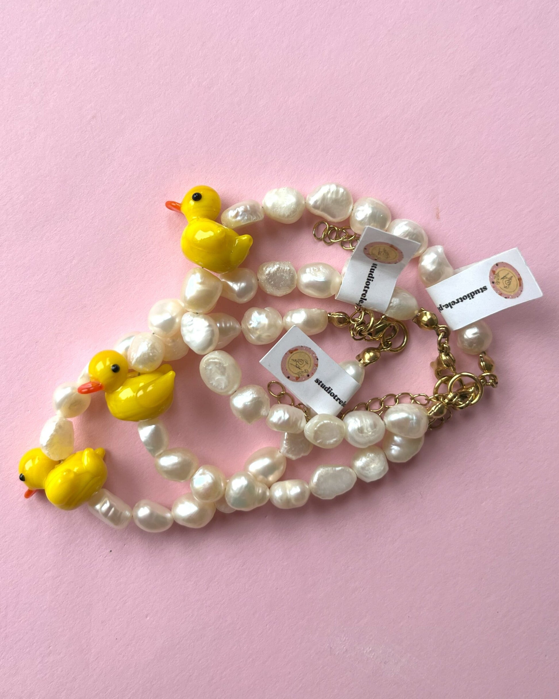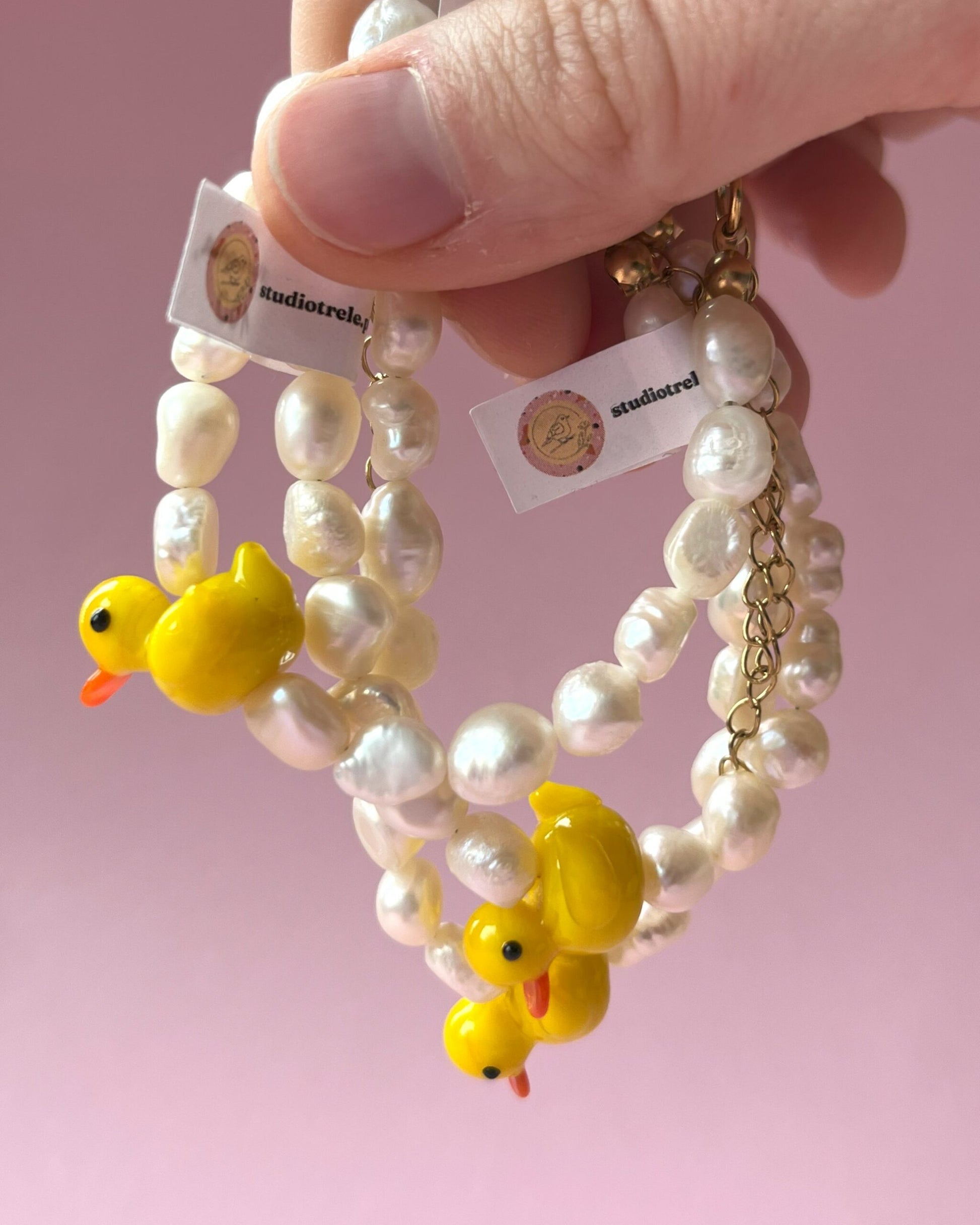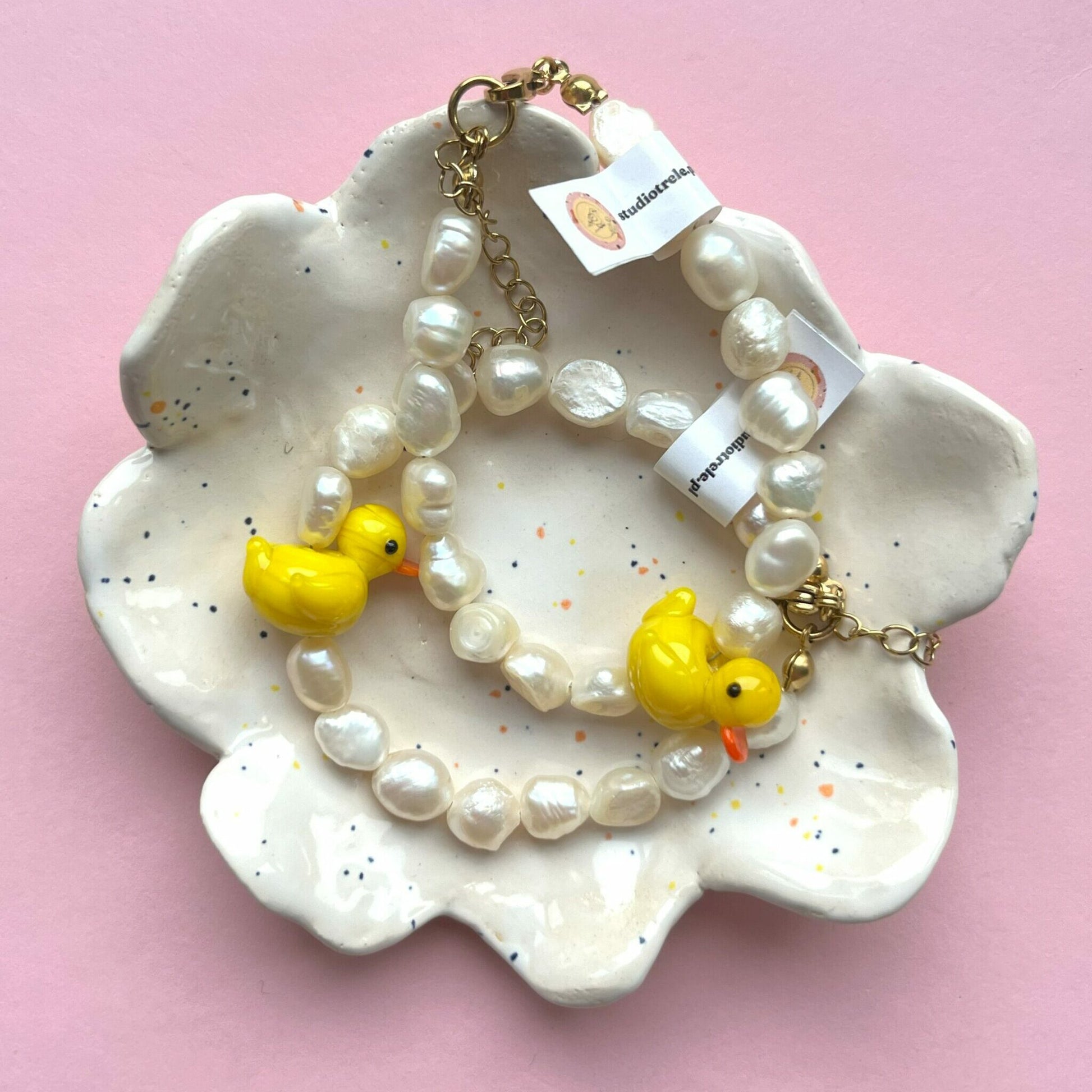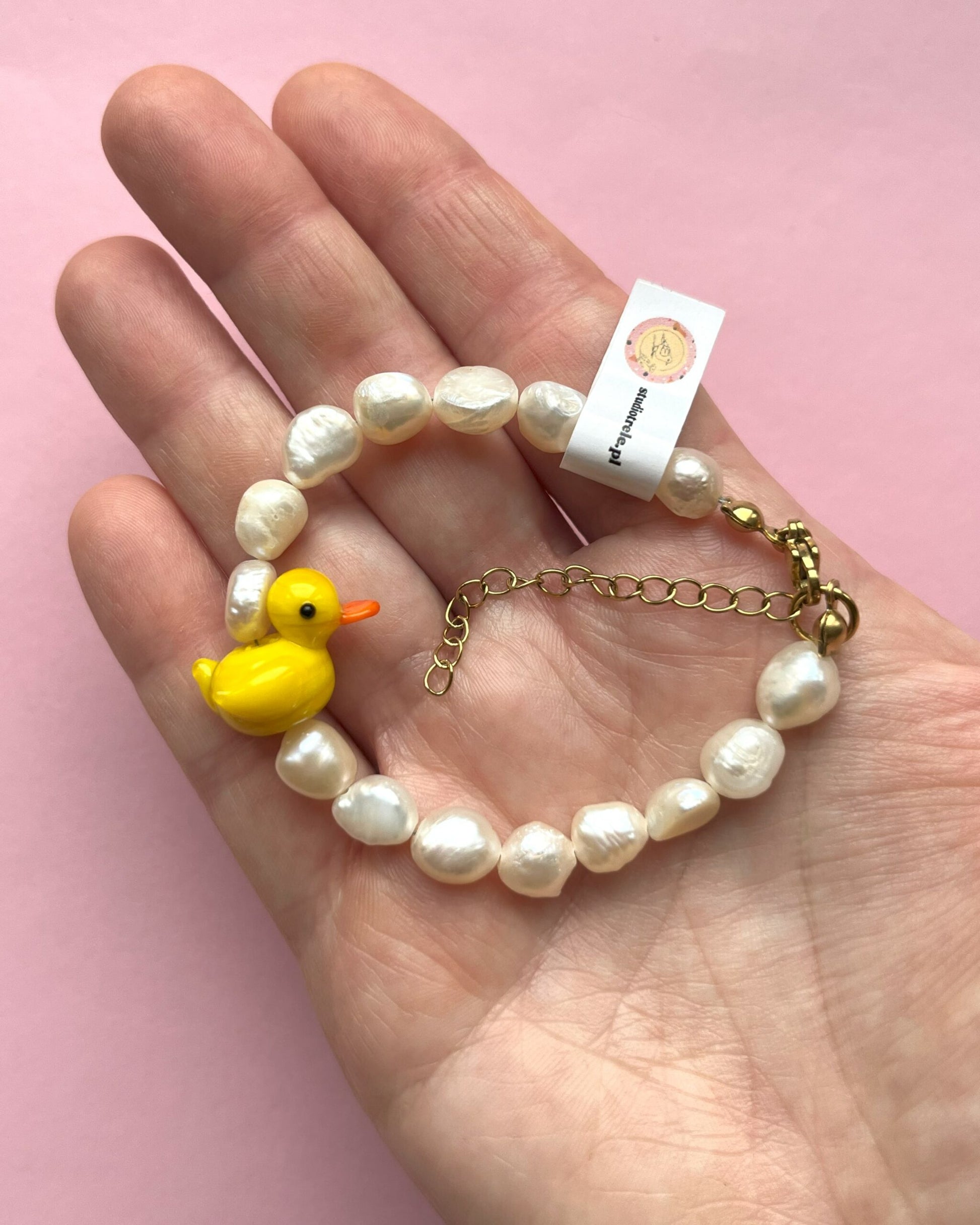 Bransoletka z naturalnych pereł barokowych została ozdobiona małą szklaną kaczuszką, która przełamuje elegancję pereł lekkim, nieoczywistym akcentem. To biżuteria, która przyciąga spojrzenia i wywołuje uśmiech – delikatna, ale z charakterem.