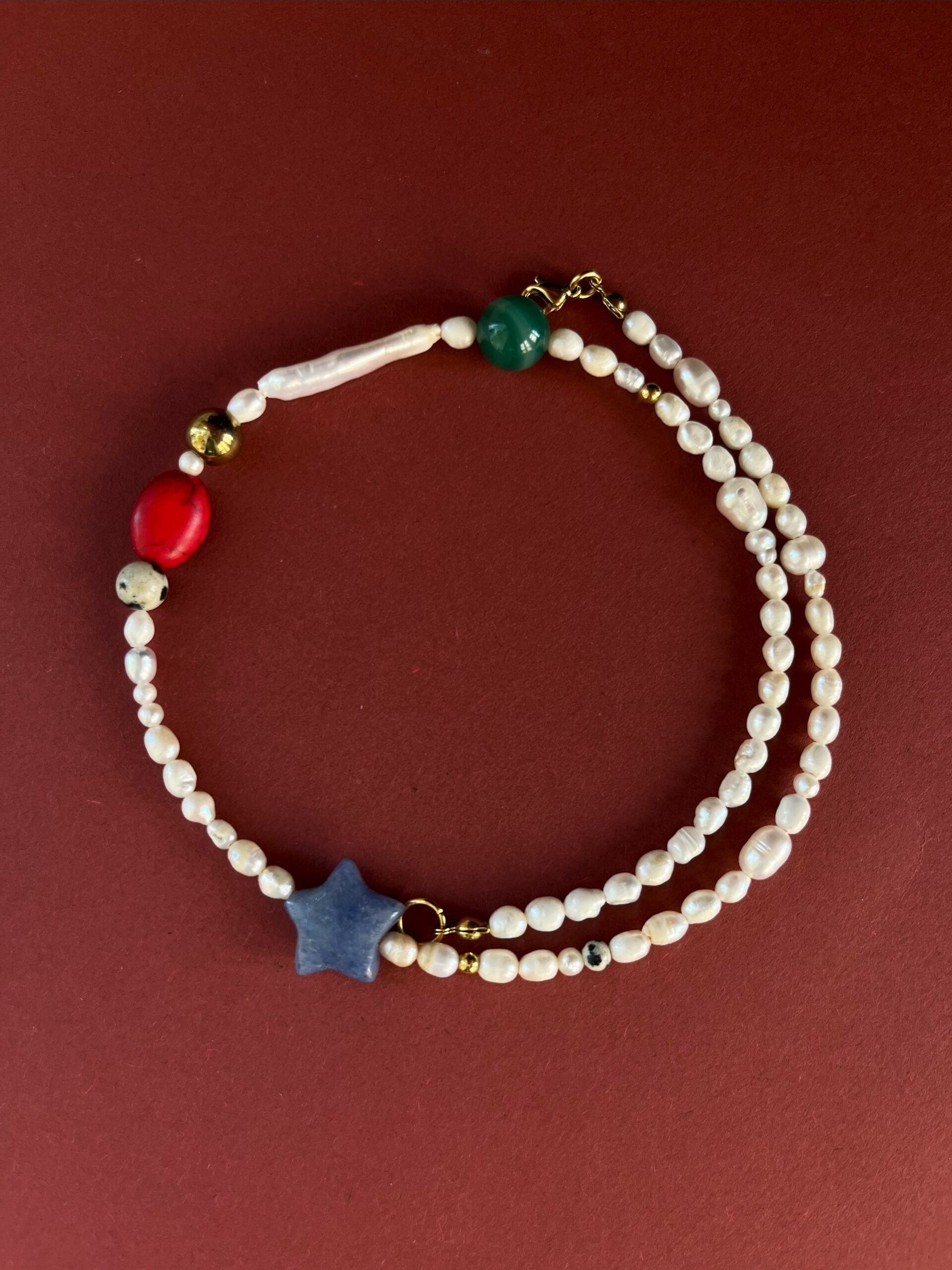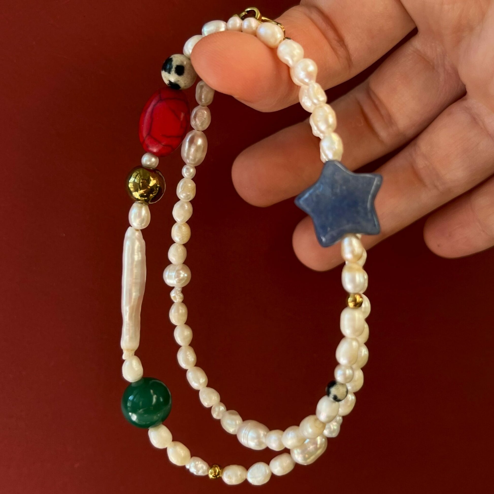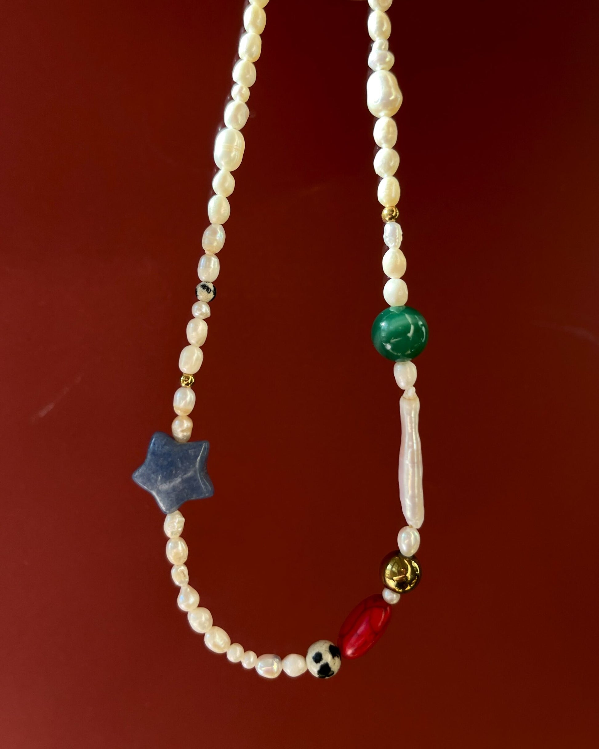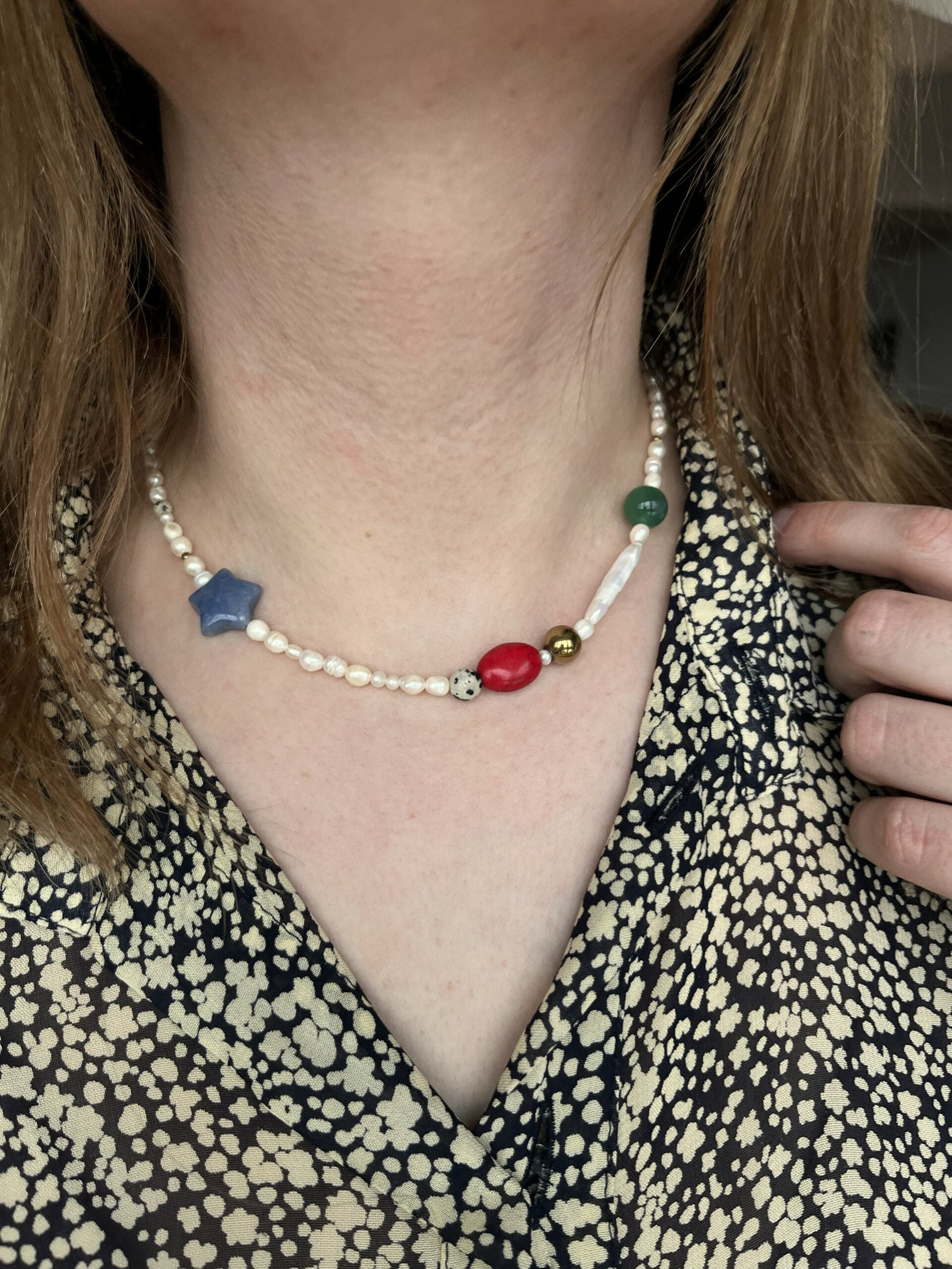 Skład: perła słodkowodna, agat, sodalit, howlit, jaspis dalmatyński, hematyt