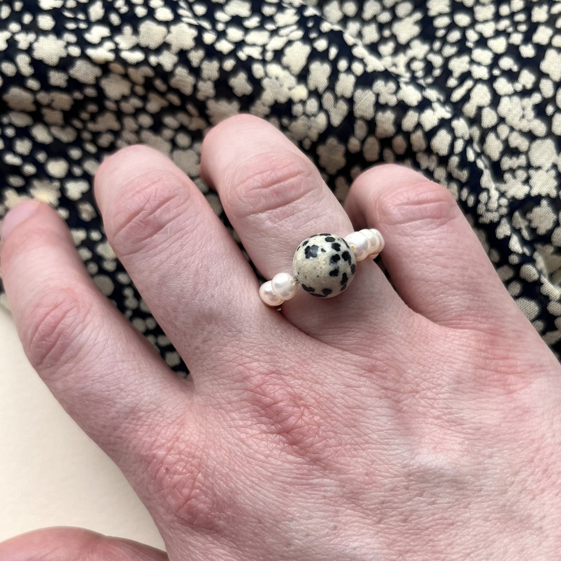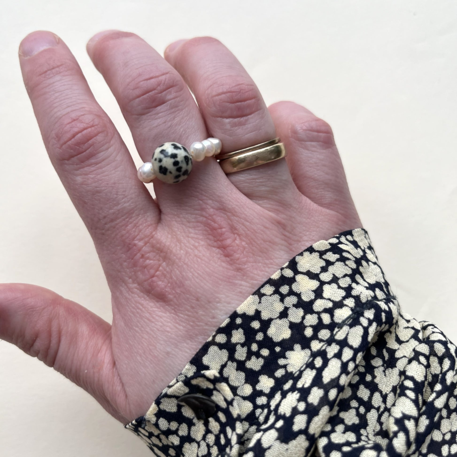 Minimalistyczny pierścionek z naturalnej perły i kulki z kamienia.
