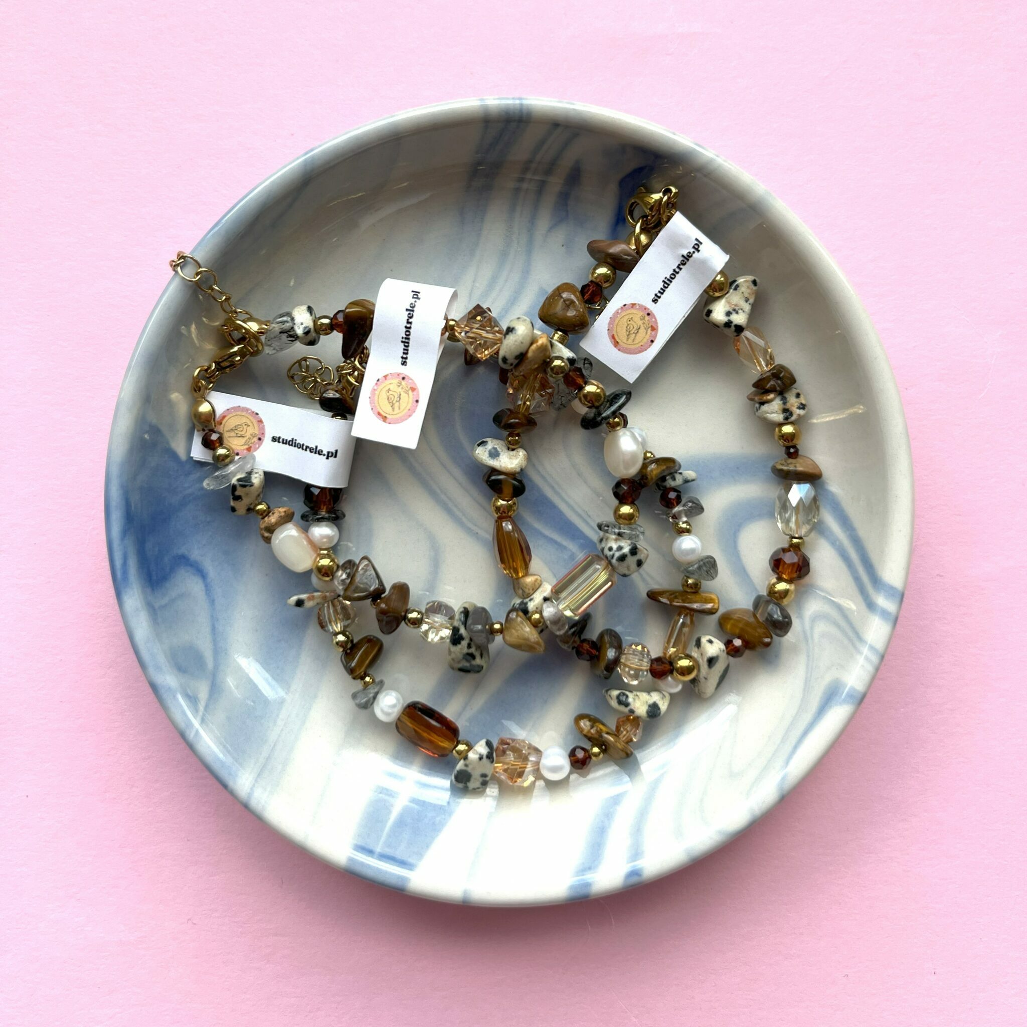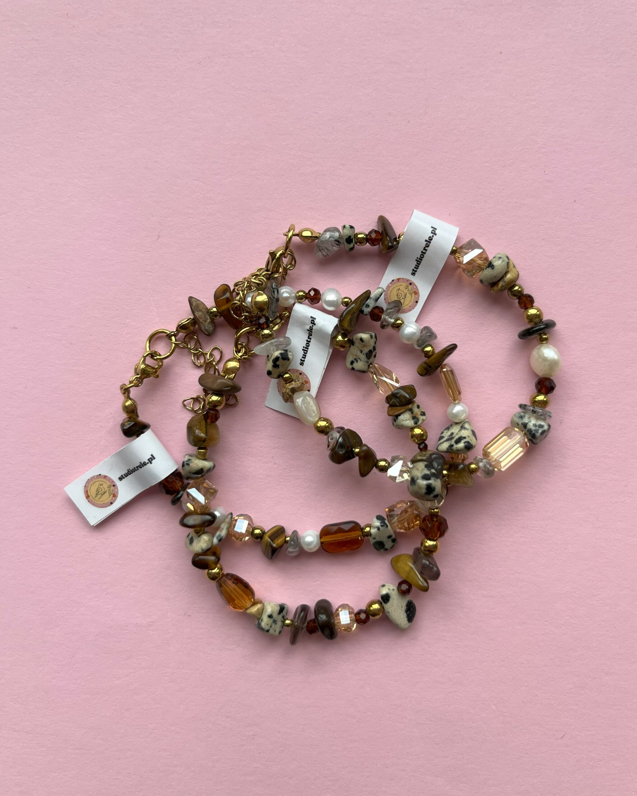 Skład: jaspis dalmatyński, perła słodkowodna, szkło, tygrysie oko, hematyt
