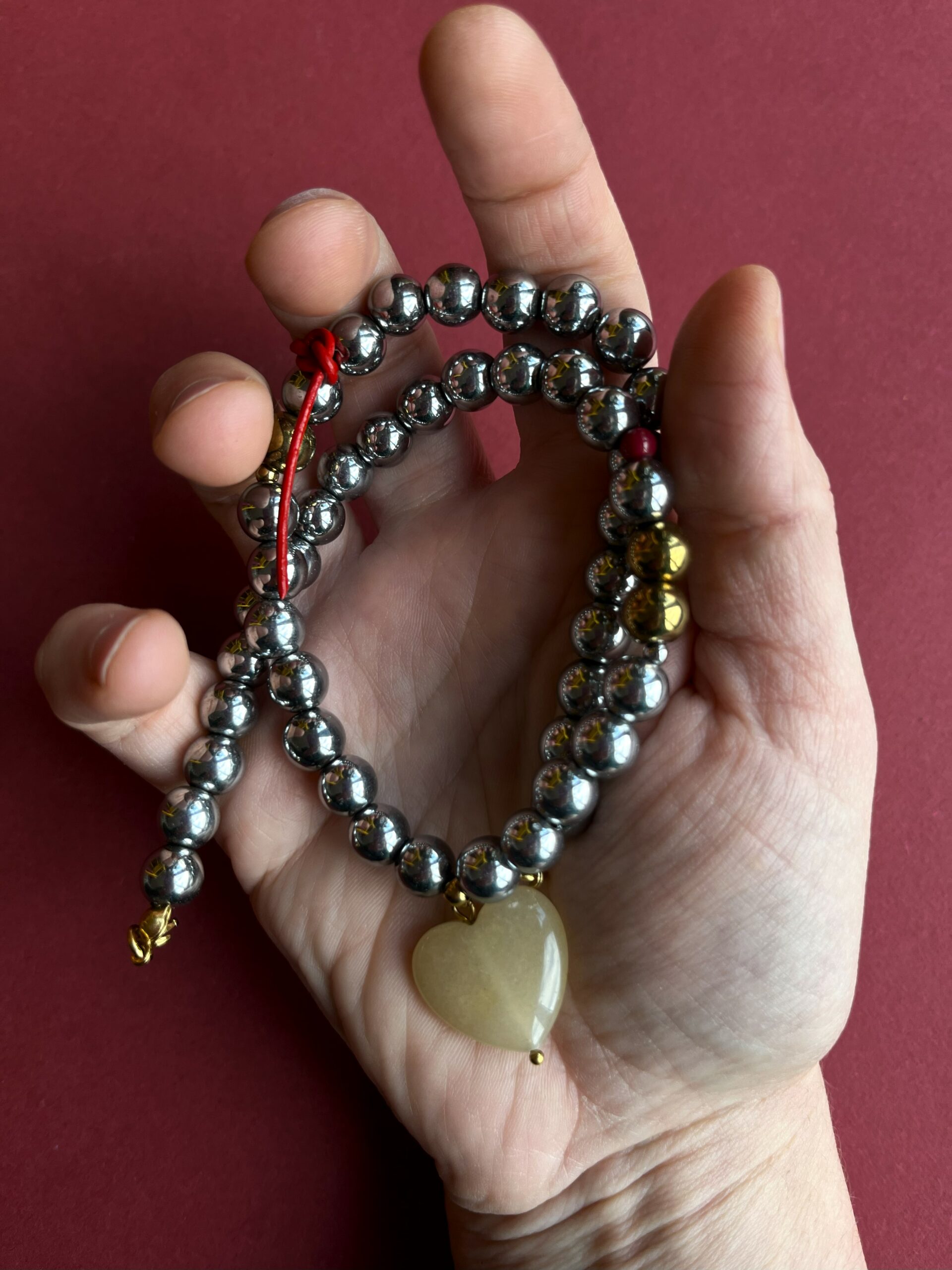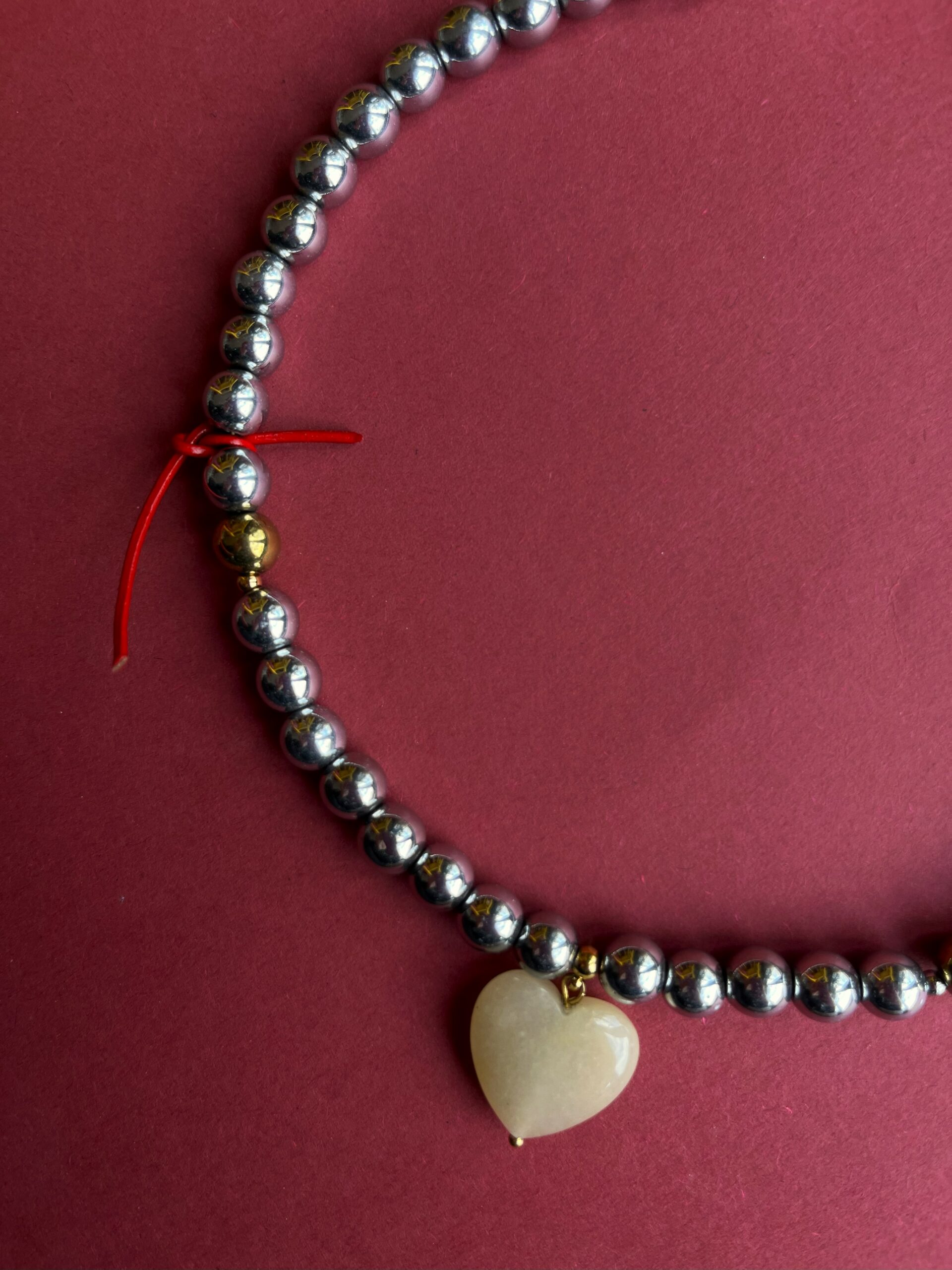 W centrum kompozycji znajduje się serce z żółtego jadeitu, a z boku delikatny rzemyk, który dodaje całości charakteru i odrobiny ognia.