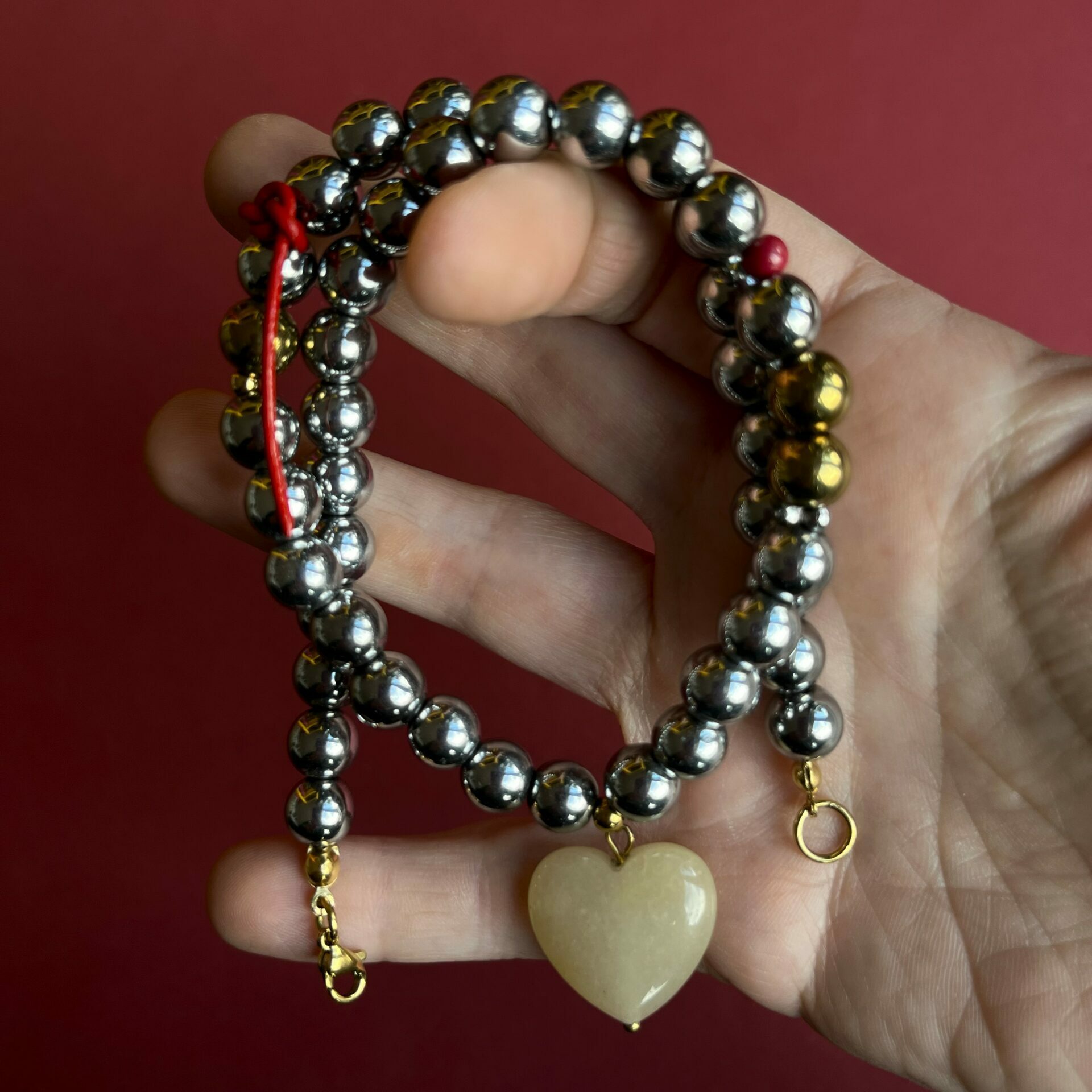 Wykonany z dużych, srebrnych kulek hematytu z subtelnymi akcentami złotego hematytu, tworzy harmonijne połączenie chłodu i ciepła, światła i cienia.