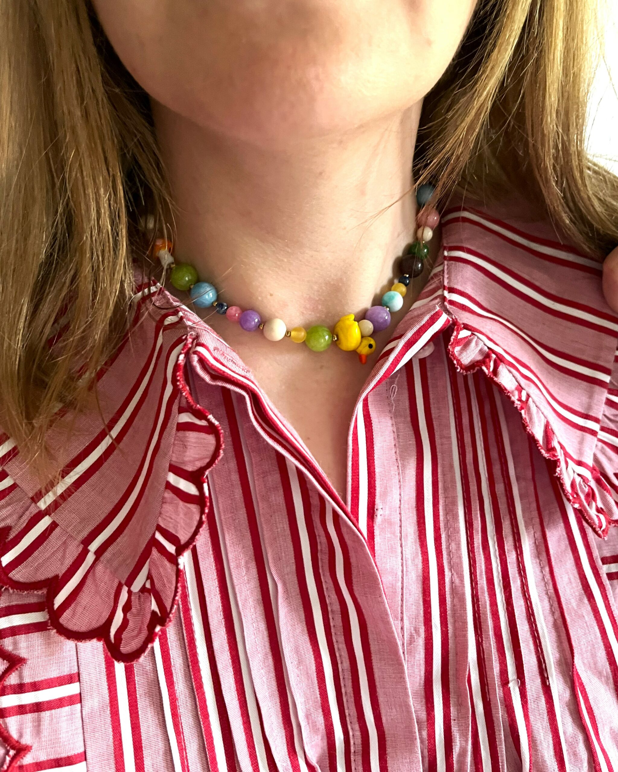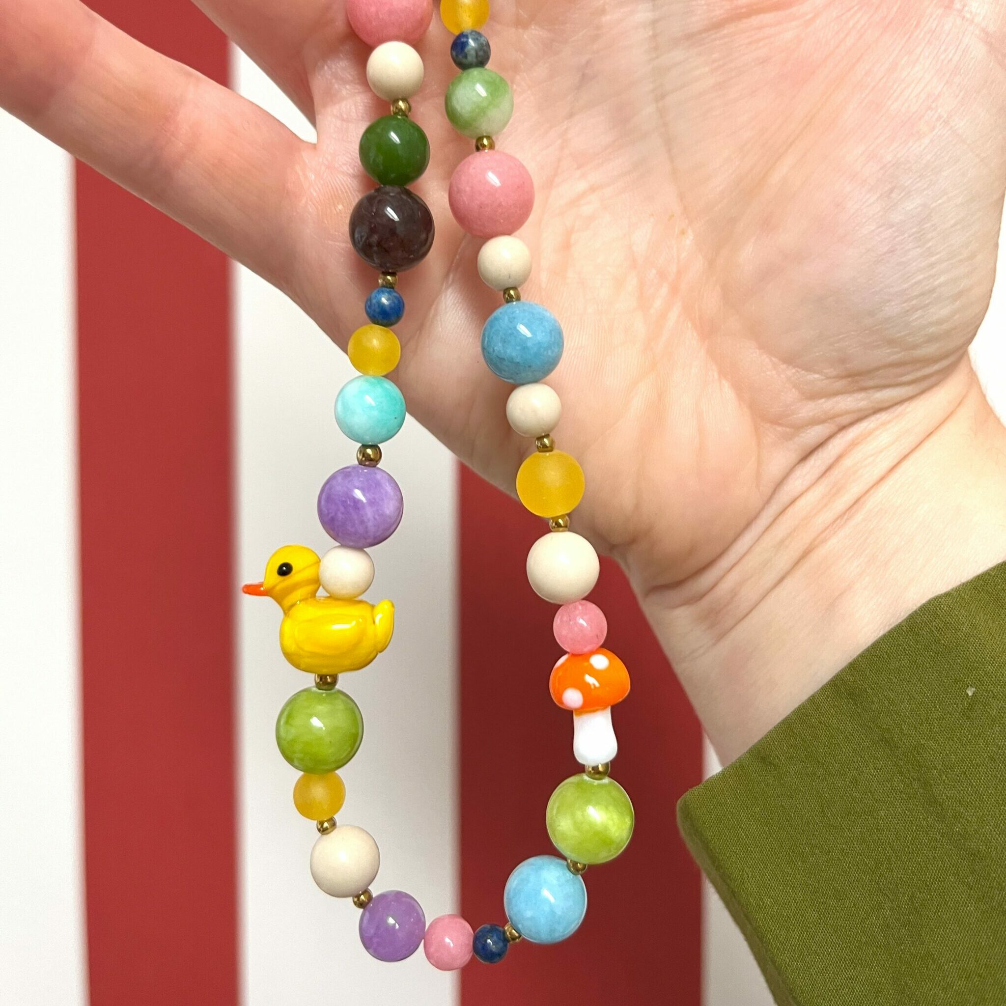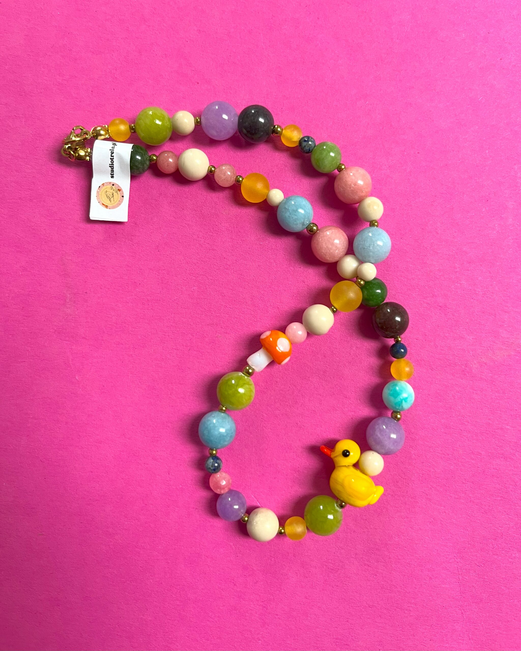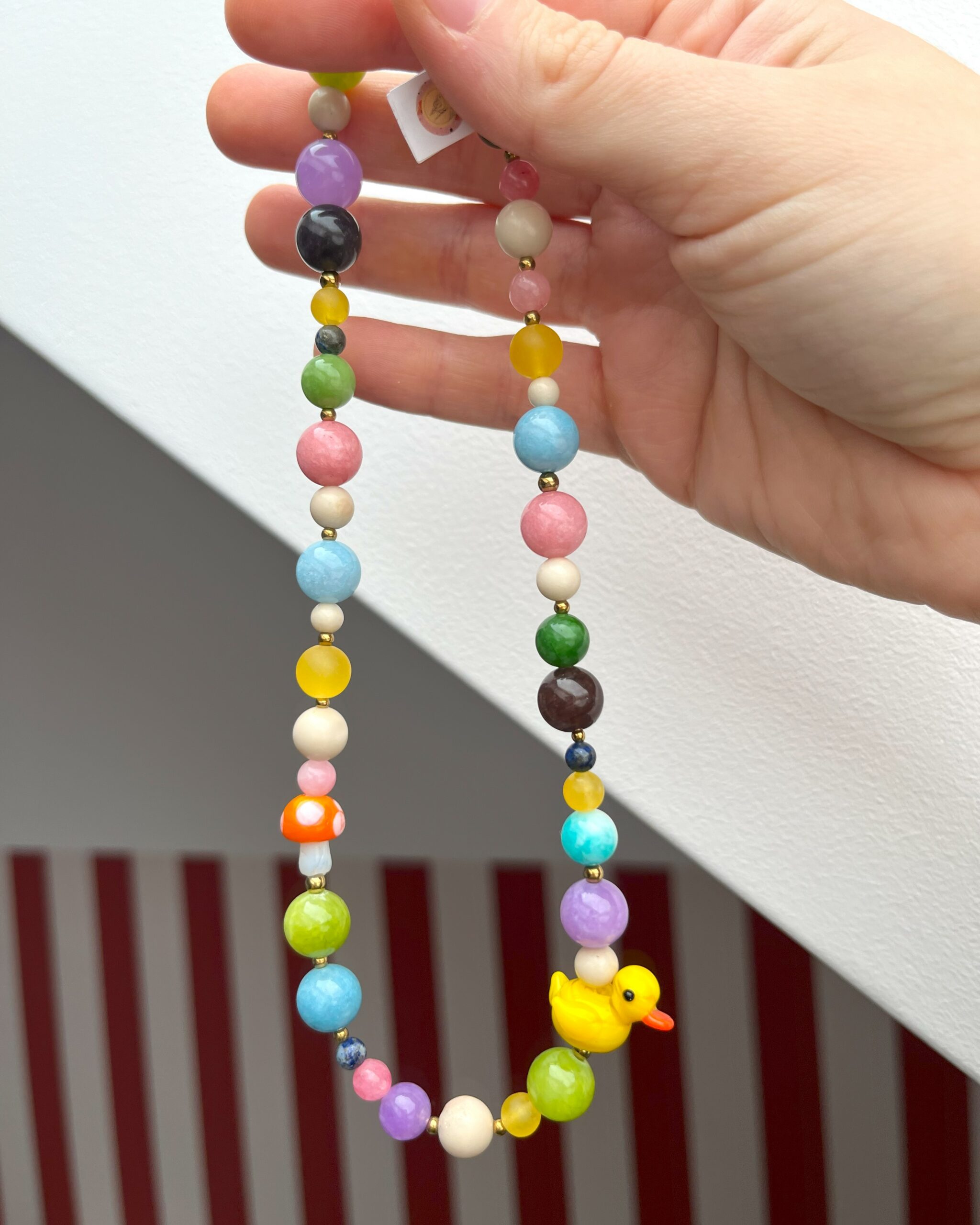Kolorowy naszyjnik z kamieni z twistem w postaci szklanej kaczuszki i grzybka