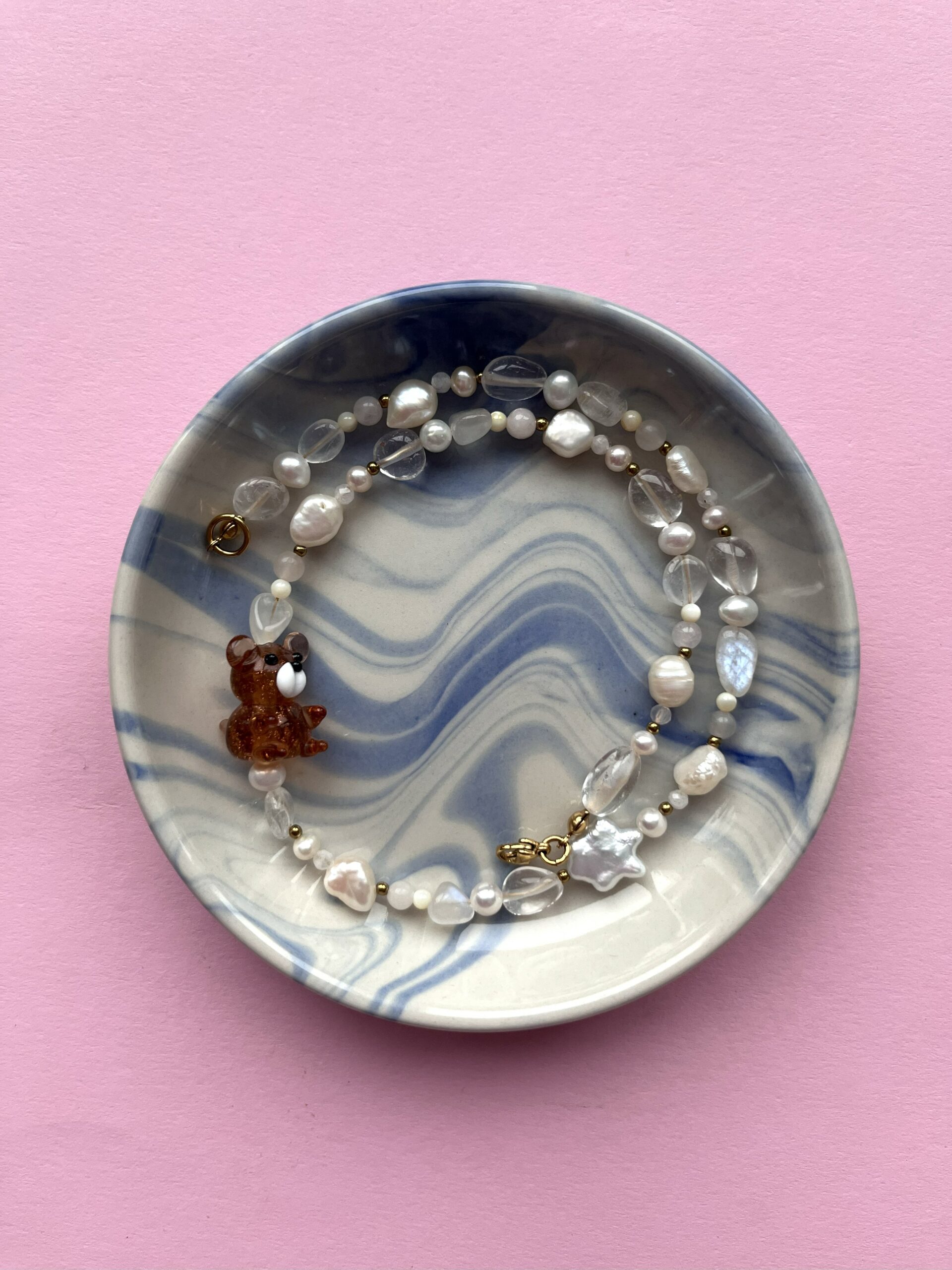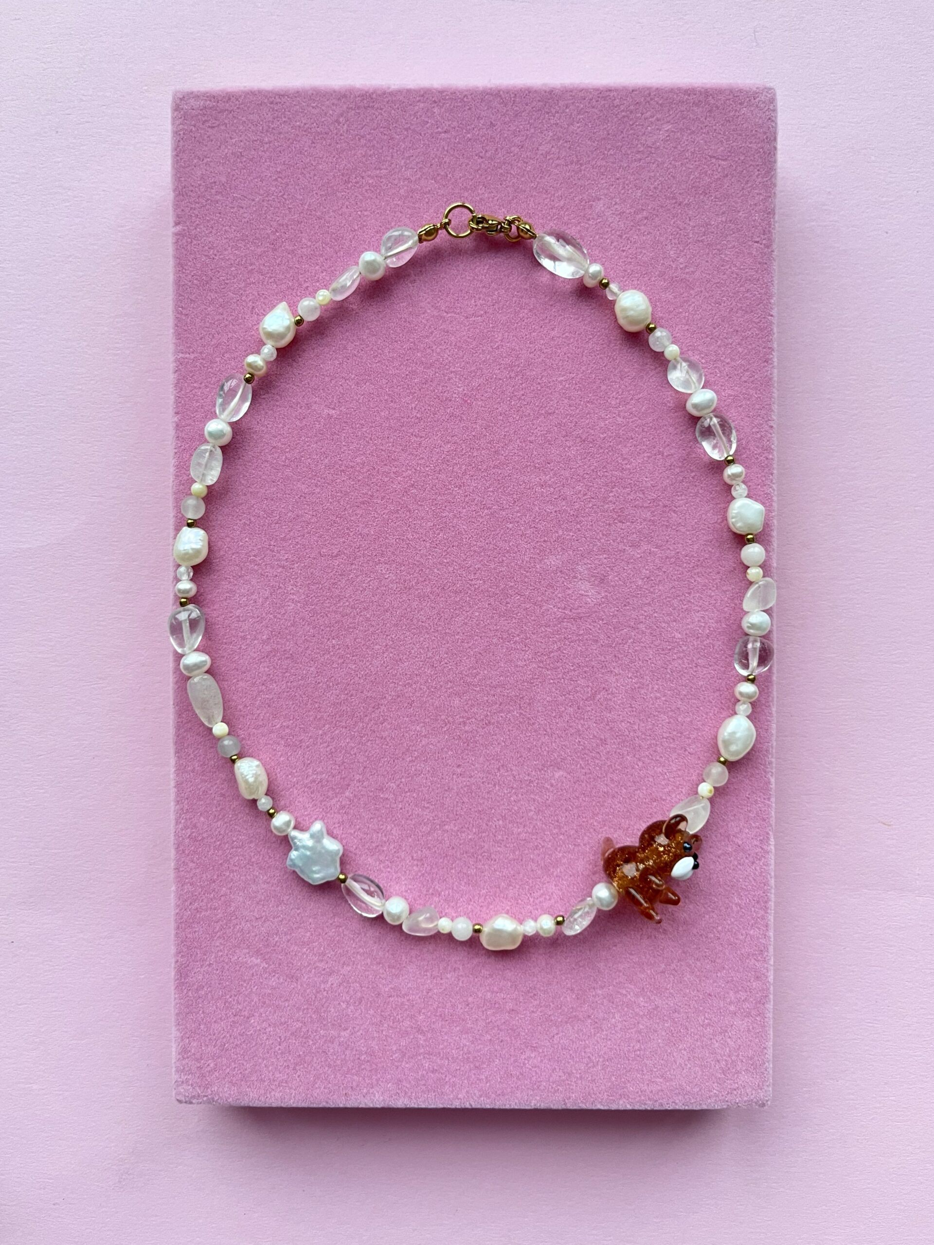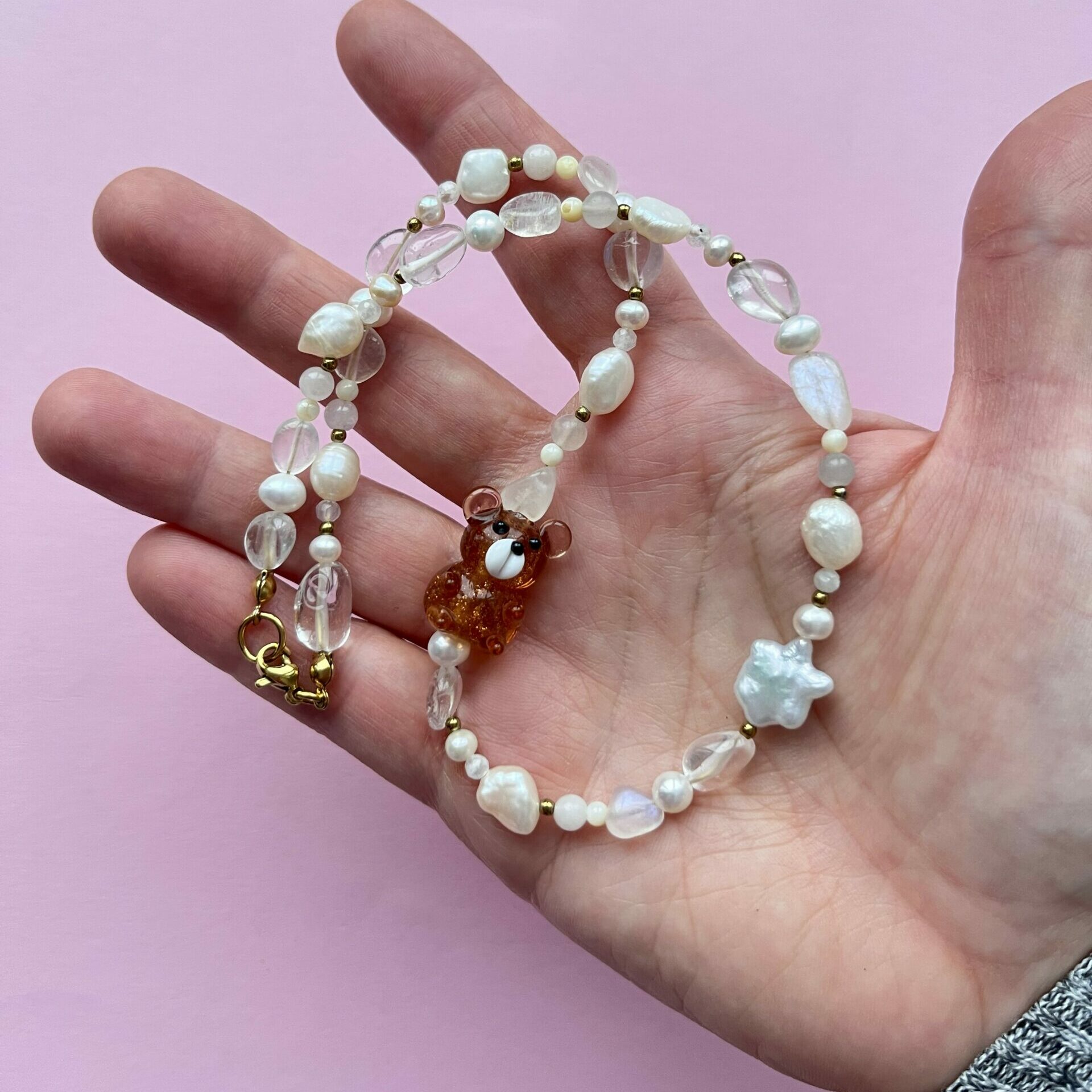 Naszyjnik z kamieni i pereł z dodatkiem szklanego misia