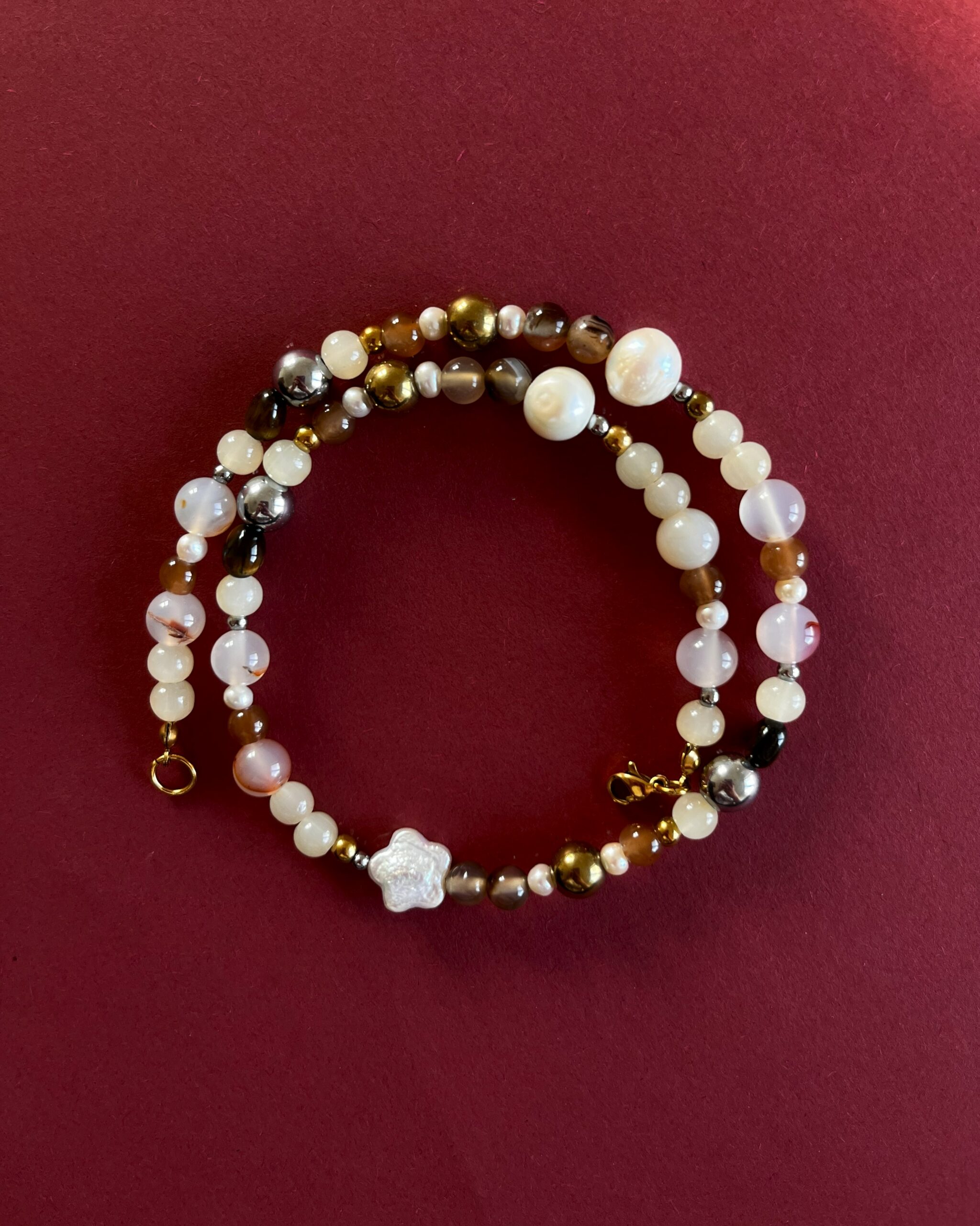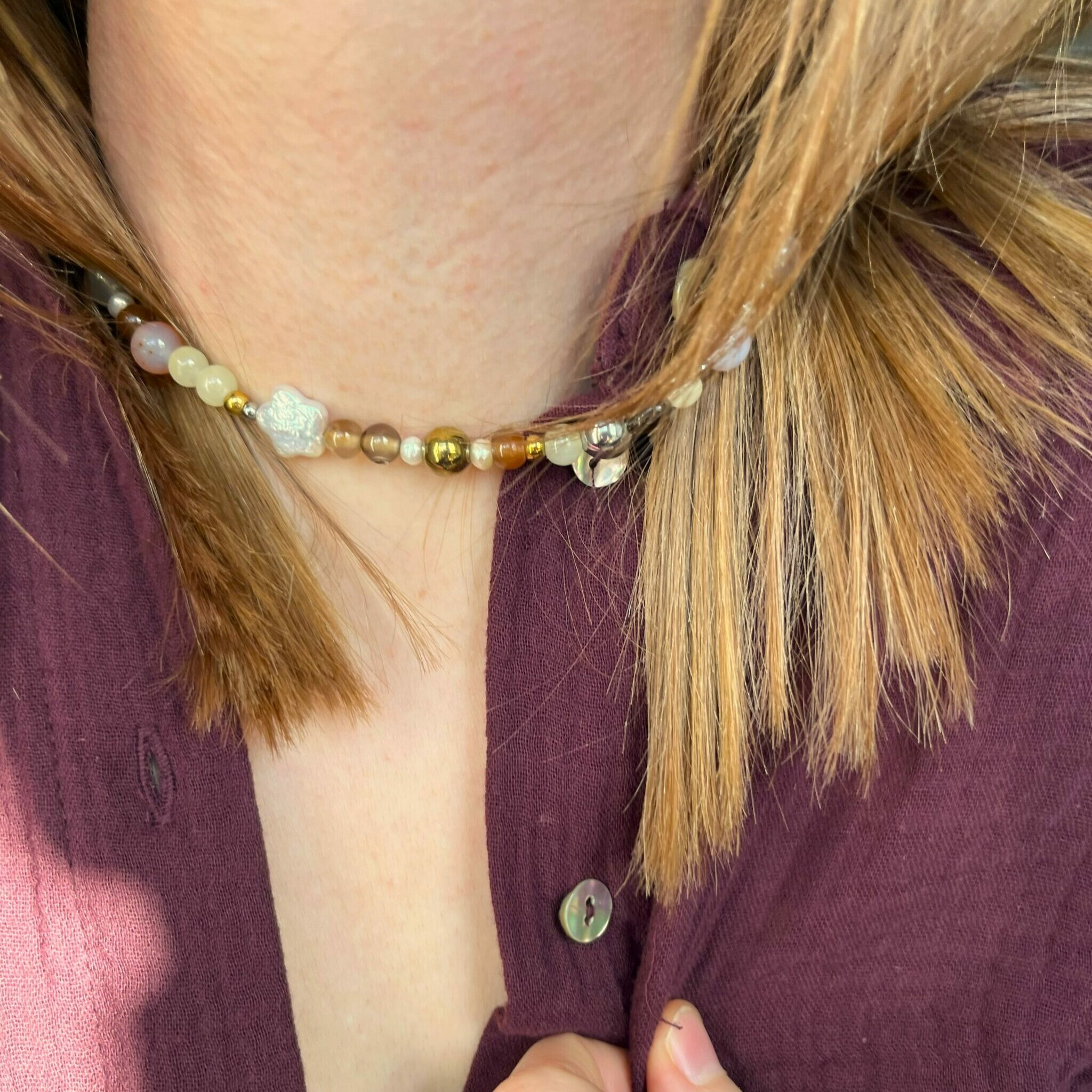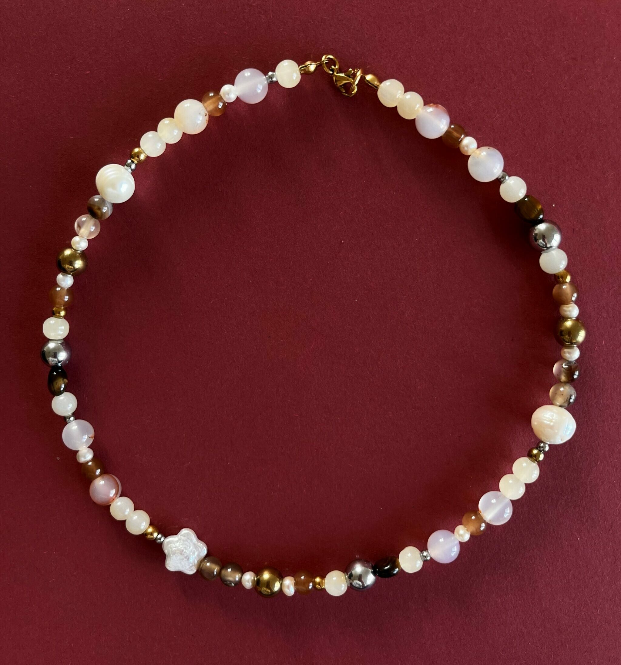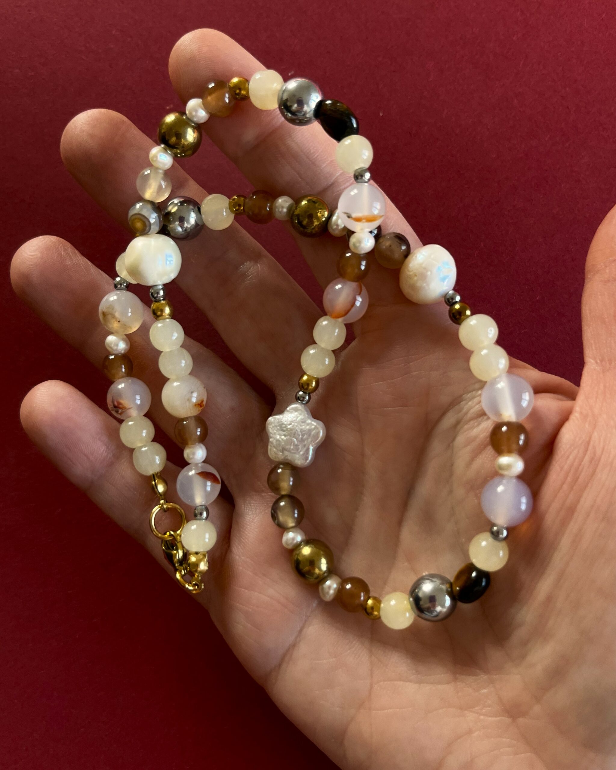 Naszyjnik Aura to harmonijne połączenie światła i ziemi. Odcienie beżu, kremu i brązu przeplatają się ze złotymi i srebrnymi refleksami, tworząc kompozycję pełną spokoju i ciepła.