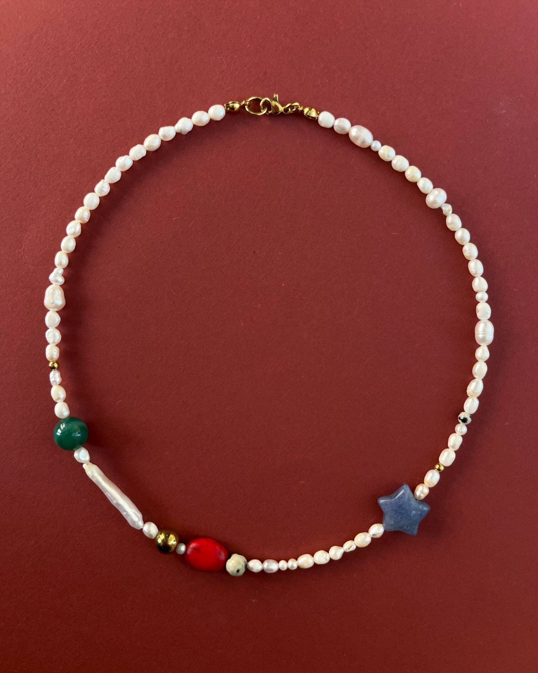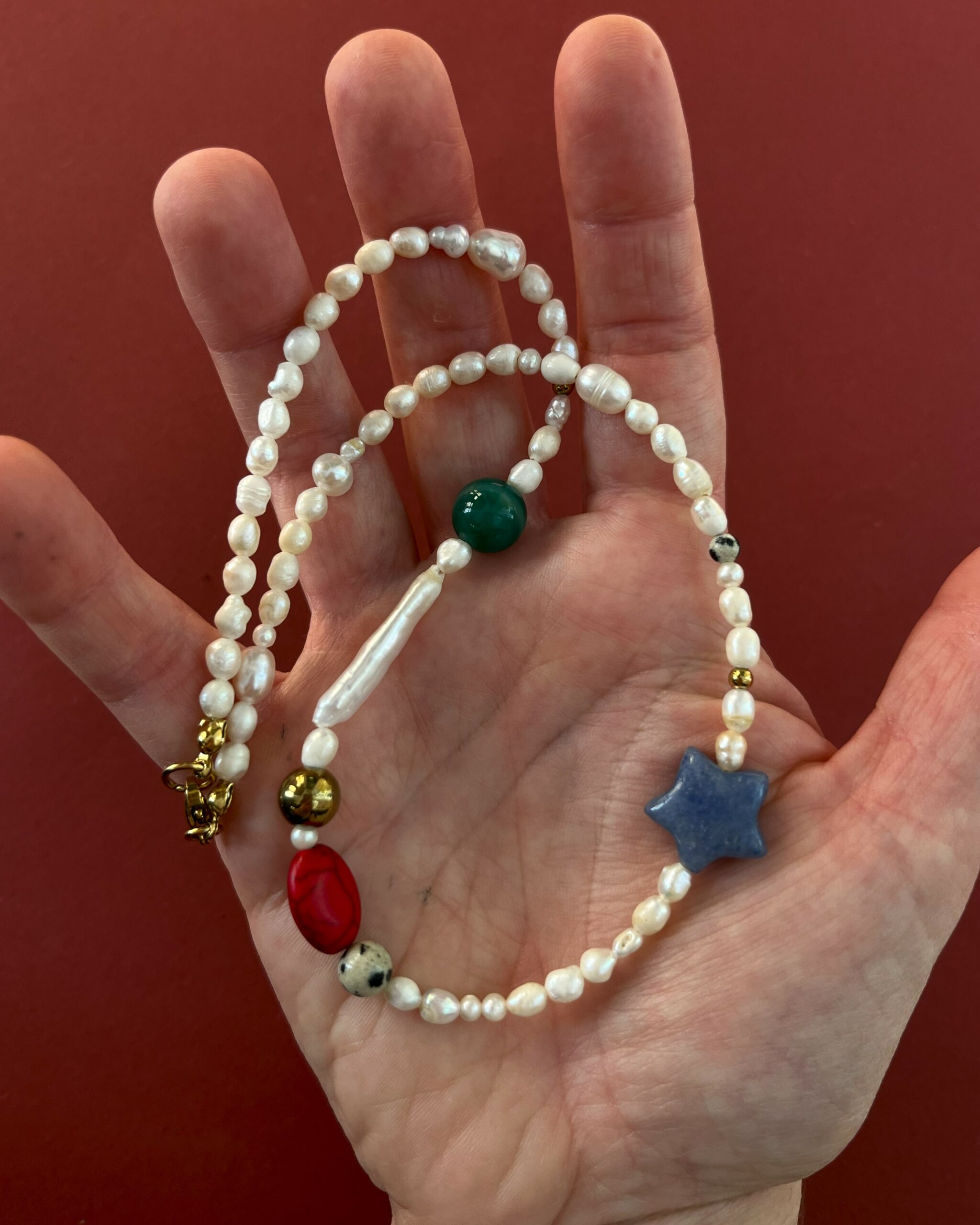 Skład: perła słodkowodna, agat, sodalit, howlit, jaspis dalmatyński, hematyt