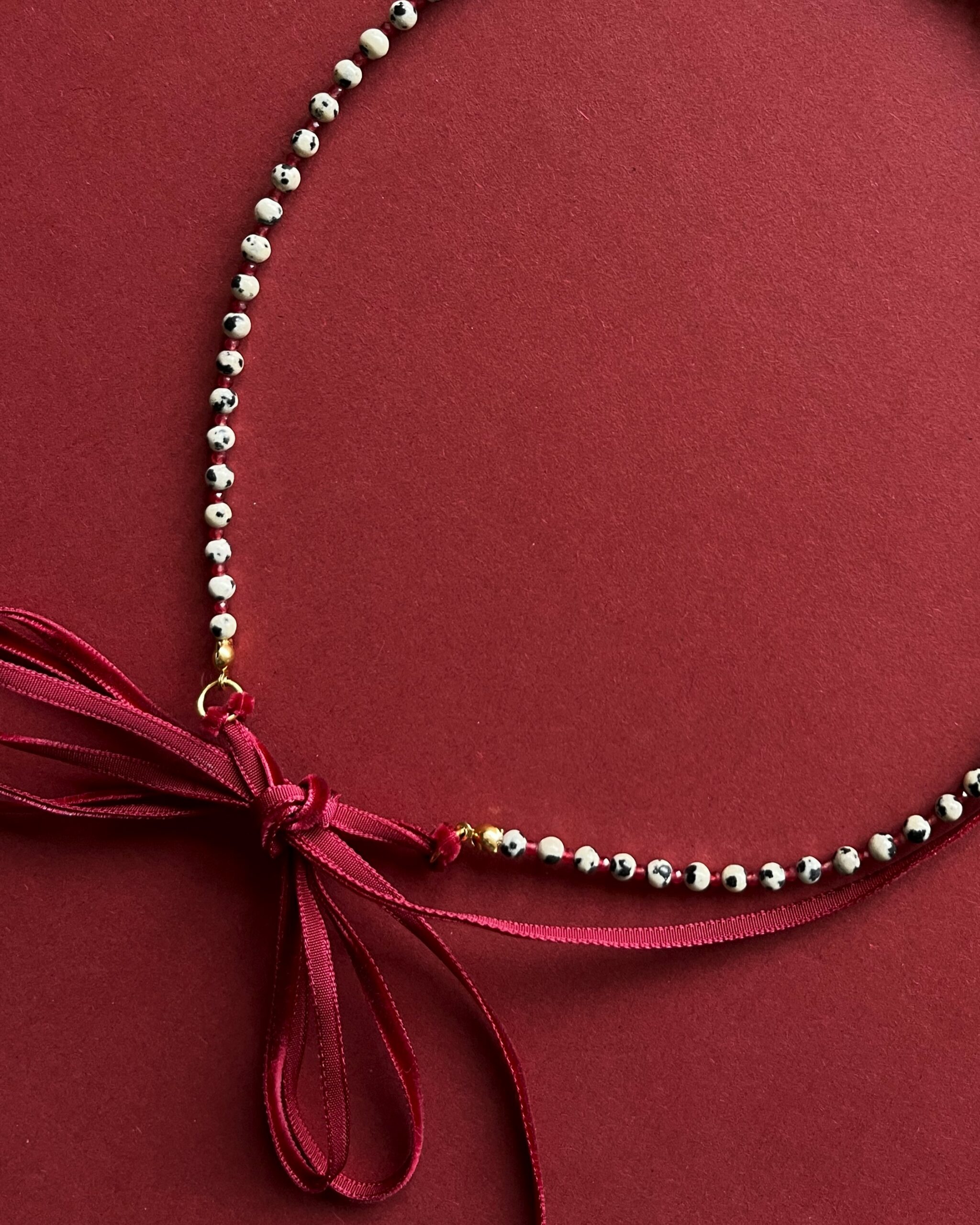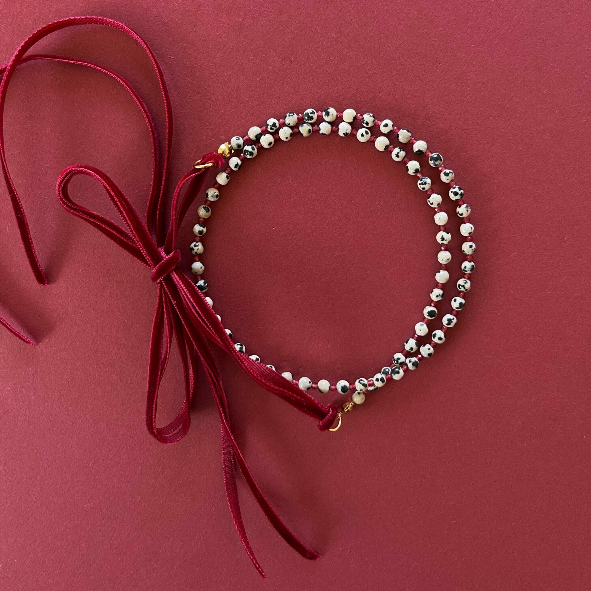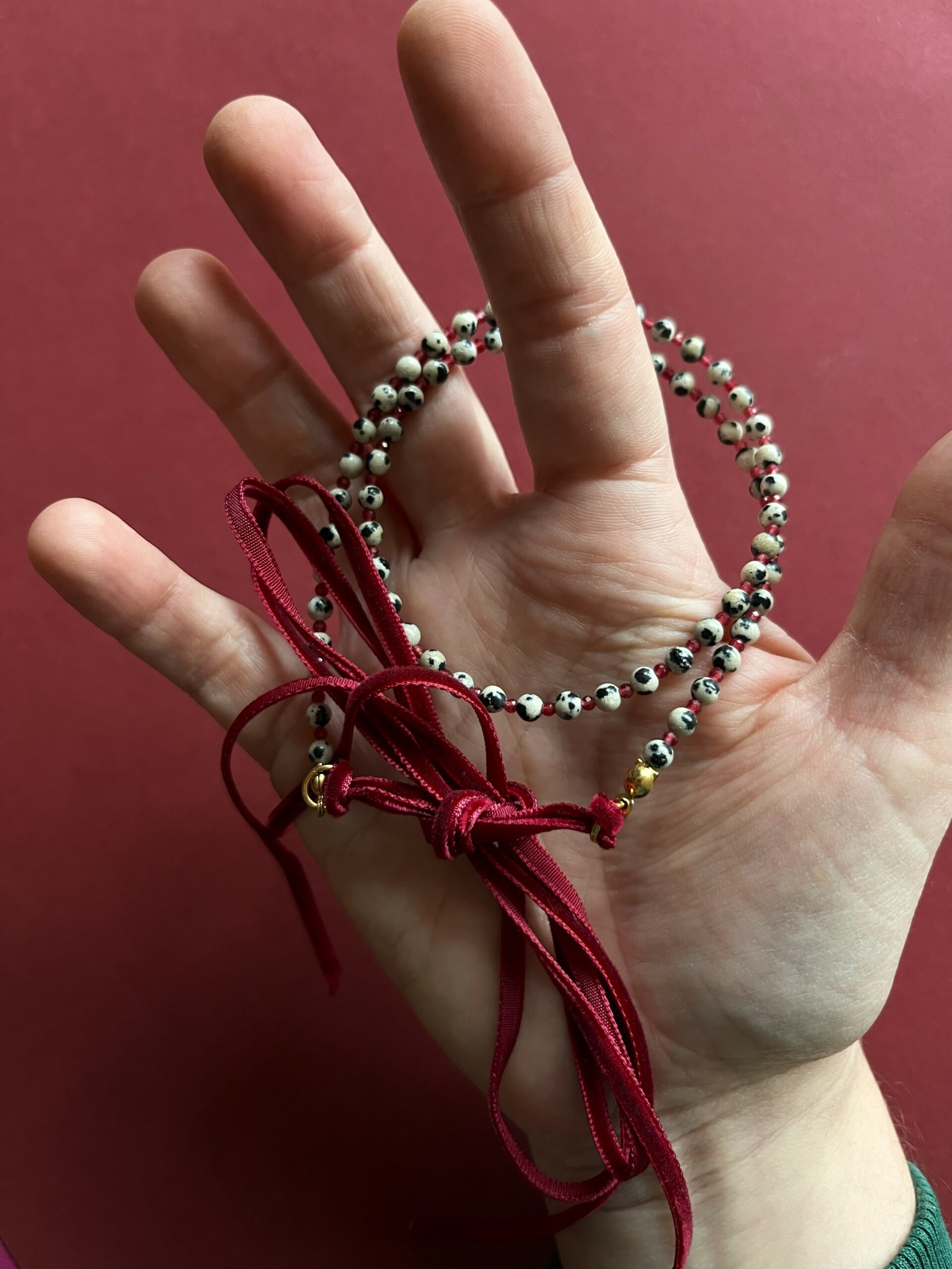 Naszyjnik Noctis to opowieść o nocnym blasku. Powstał z drobnych kamieni jaspisu dalmatyńskiego, w których przeplatają się maleńkie fasetowane kulki bordowego jadeitu – niczym ciepłe światła ukryte wśród cieni.