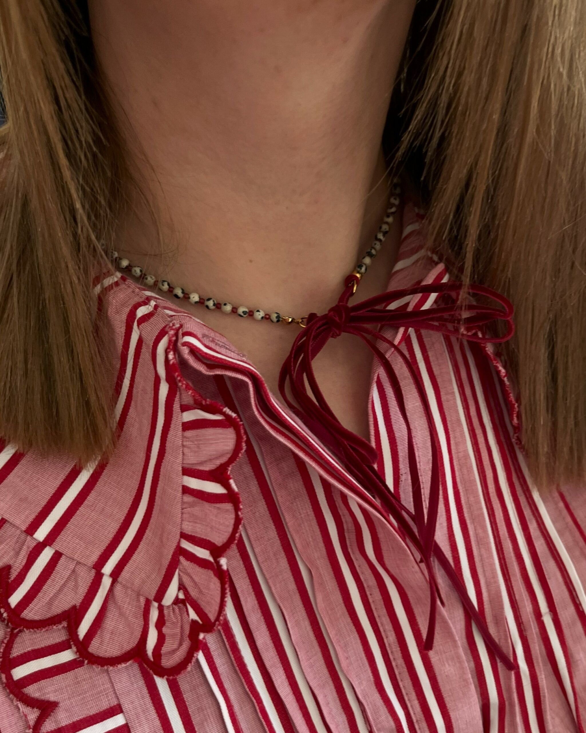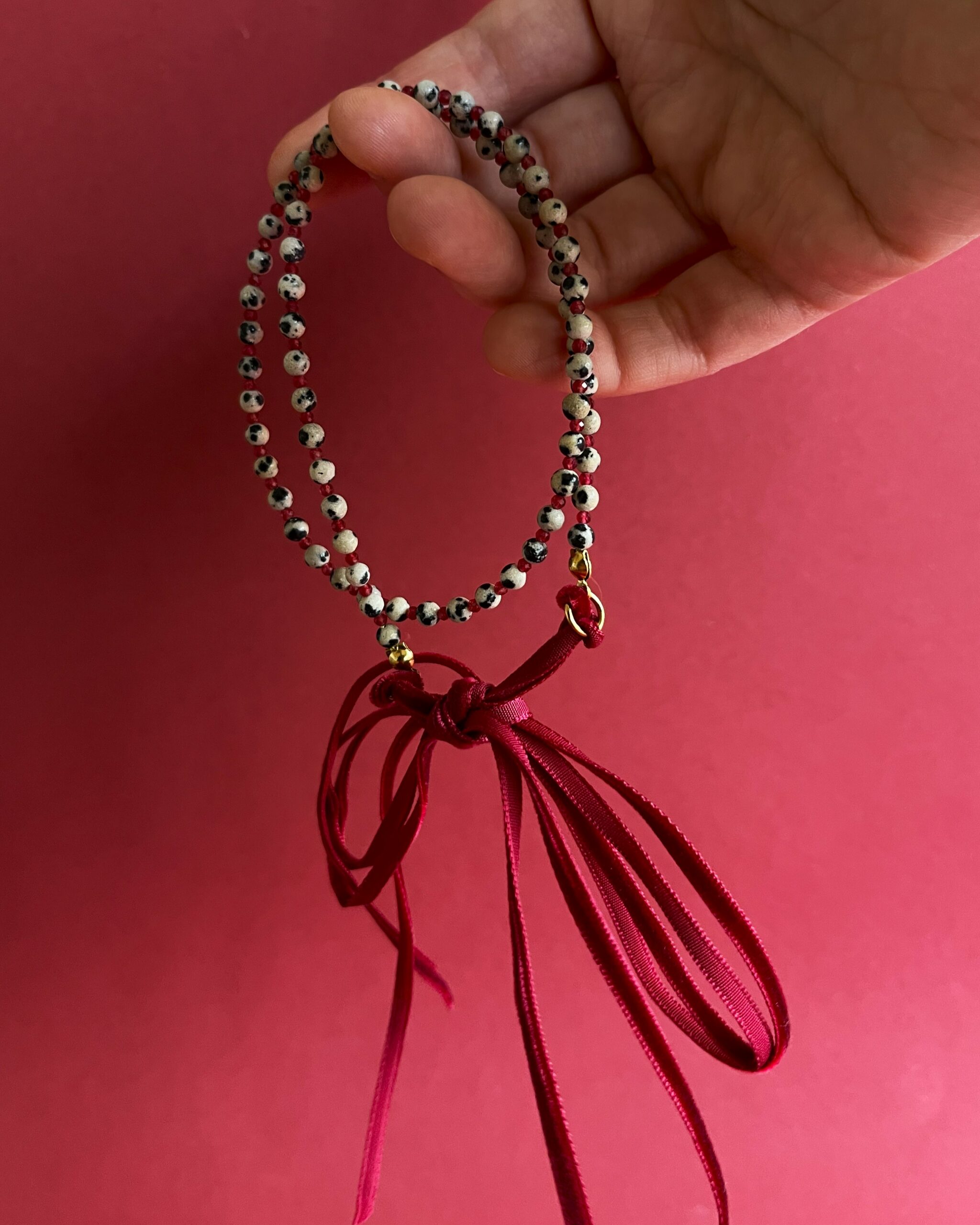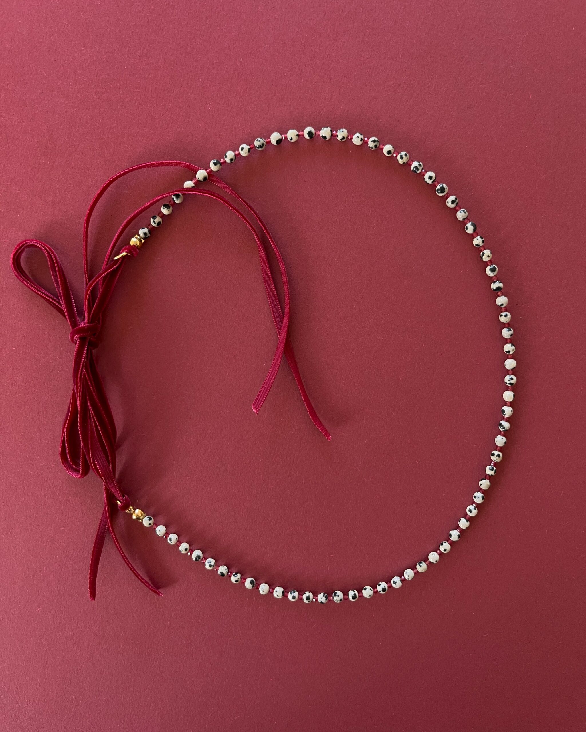Naszyjnik Noctis to opowieść o nocnym blasku. Powstał z drobnych kamieni jaspisu dalmatyńskiego, w których przeplatają się maleńkie fasetowane kulki bordowego jadeitu – niczym ciepłe światła ukryte wśród cieni.