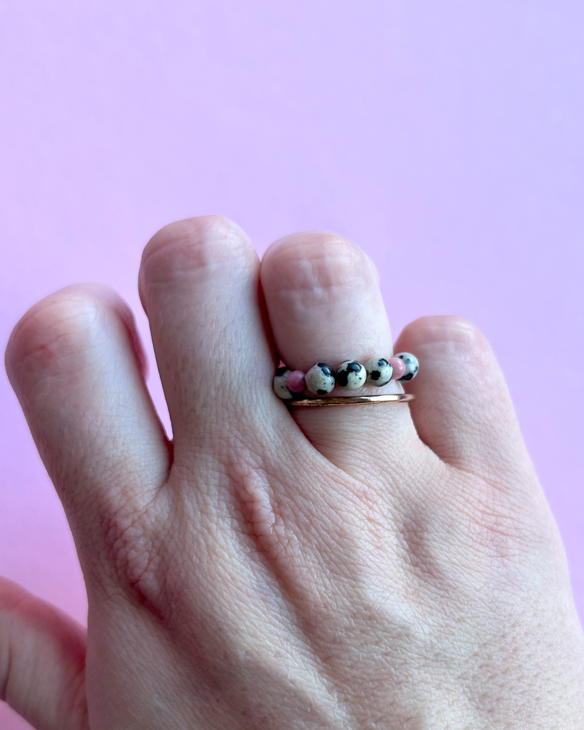 Jeśli potrzebujesz innej wielkości pierścionka, napisz do mnie wiadomość. Pierścionki są na gumce elastycznej, która fantastycznie dopasowuje się do palca, więc traktuj, proszę rozmiary bardzo orientacyjnie. Ja posiadam rozmiar L, a pierścionki w rozmiarze S też są dla mnie ok 😉