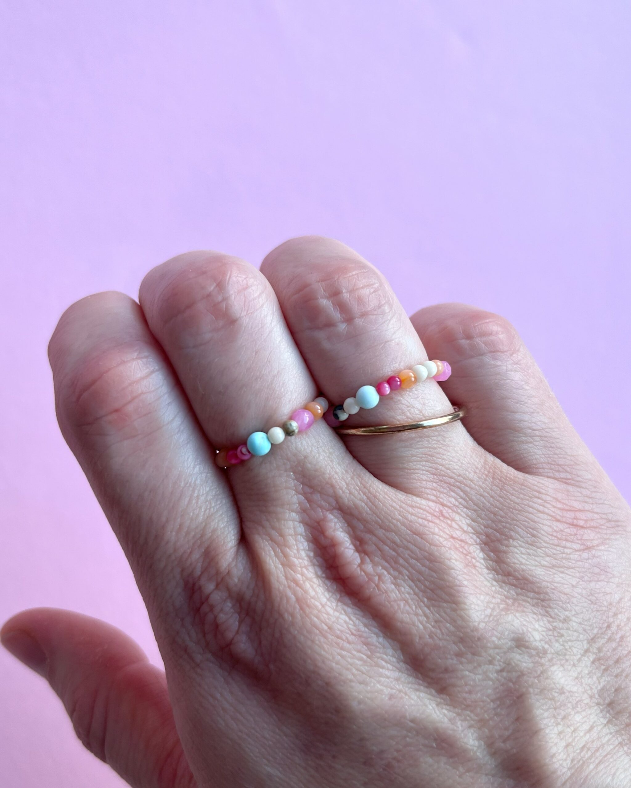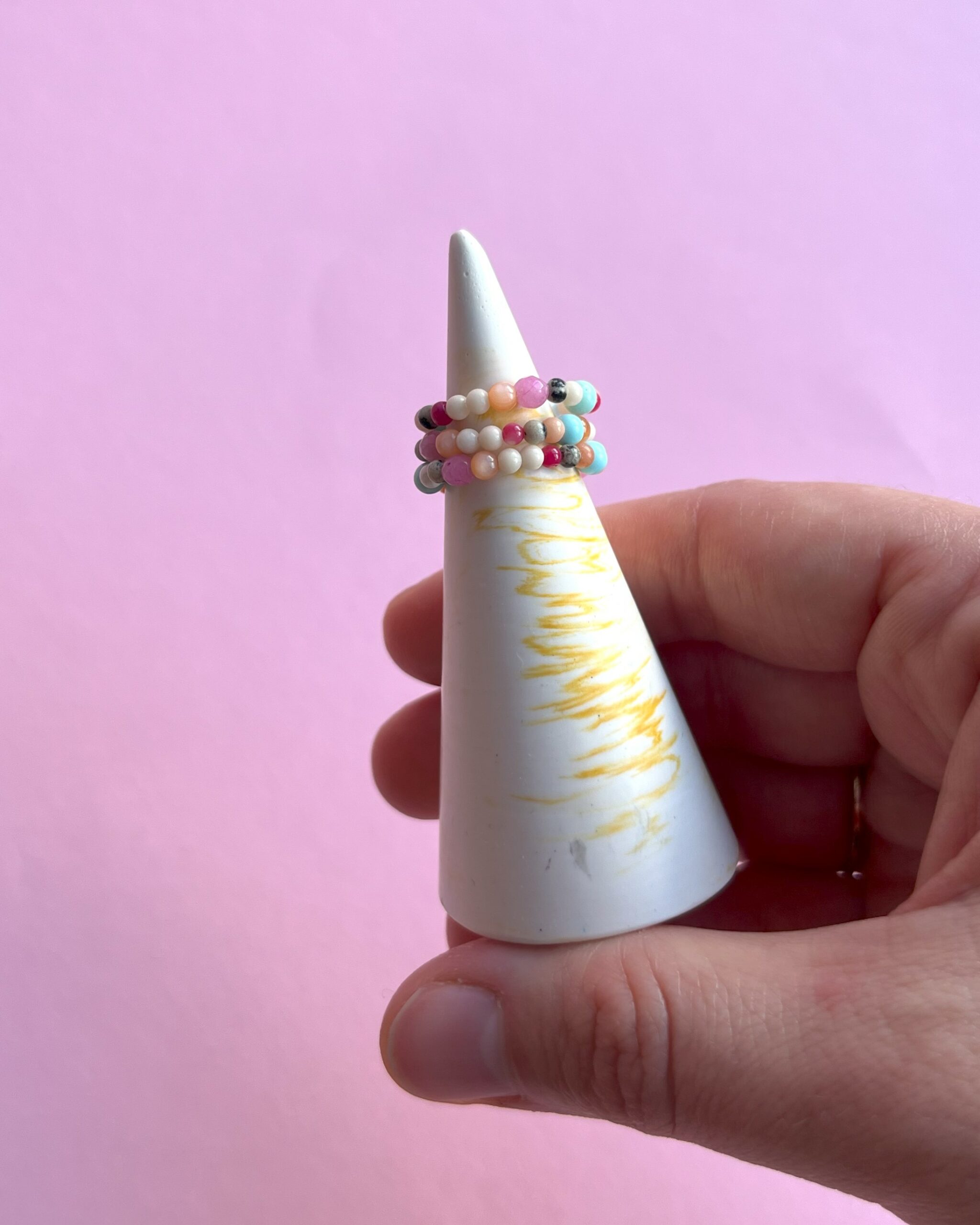 Jeśli potrzebujesz innej wielkości pierścionka, napisz do mnie wiadomość. Pierścionki są na gumce elastycznej, która fantastycznie dopasowuje się do palca, więc traktuj, proszę rozmiary bardzo orientacyjnie. Ja posiadam rozmiar L, a pierścionki w rozmiarze S też są dla mnie ok 😉