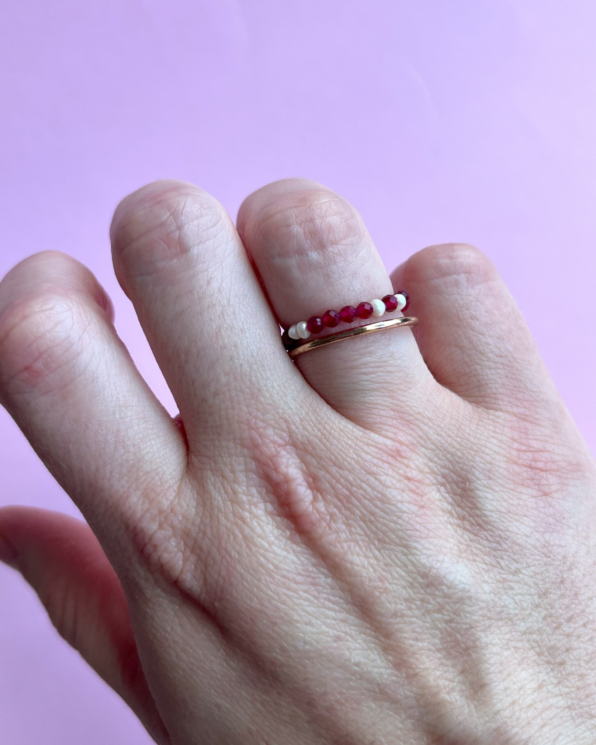 Pierścionek na gumce elastycznej pełen pięknych, malutkich pereł. Niezwykle wygodny, dopełni każdą stylizację.