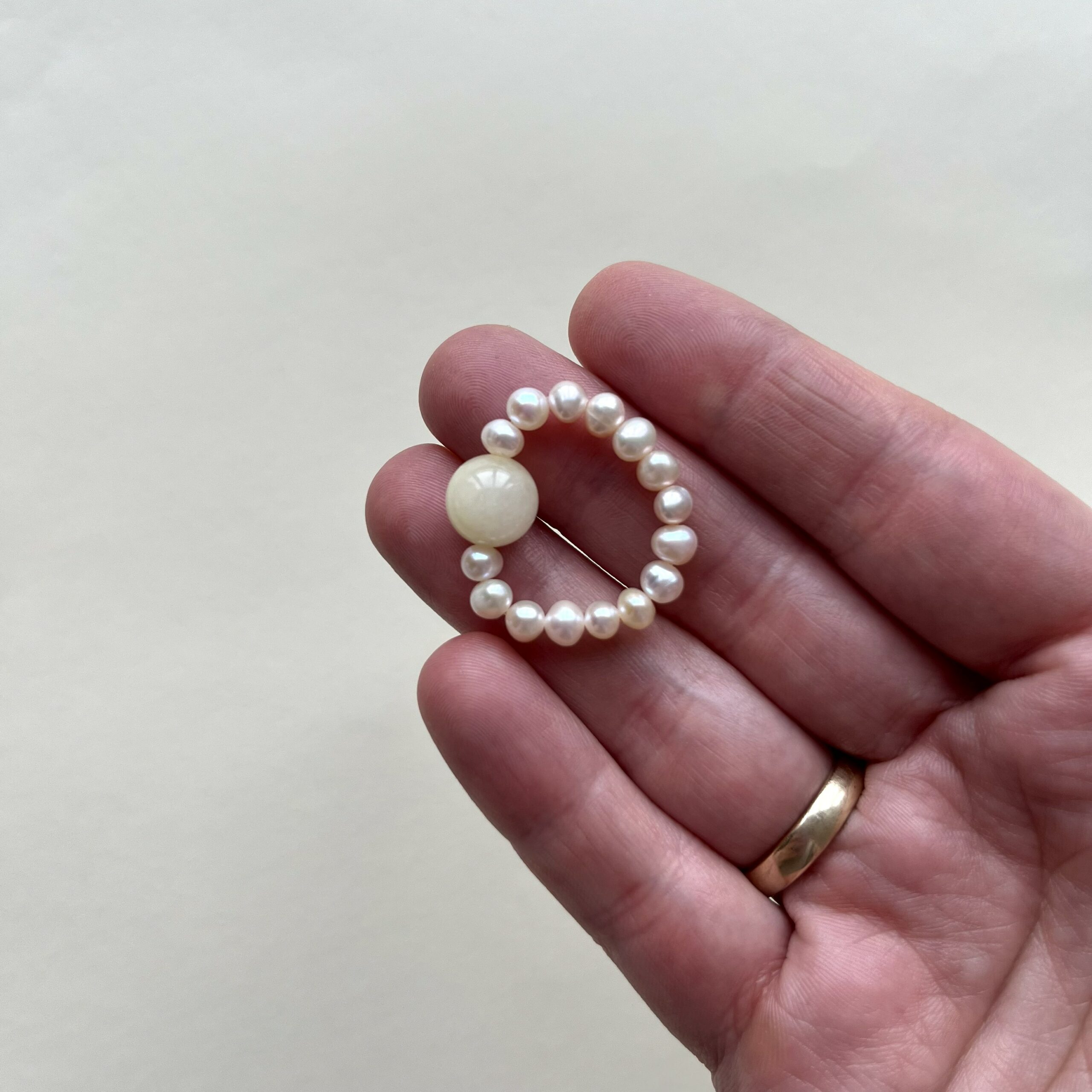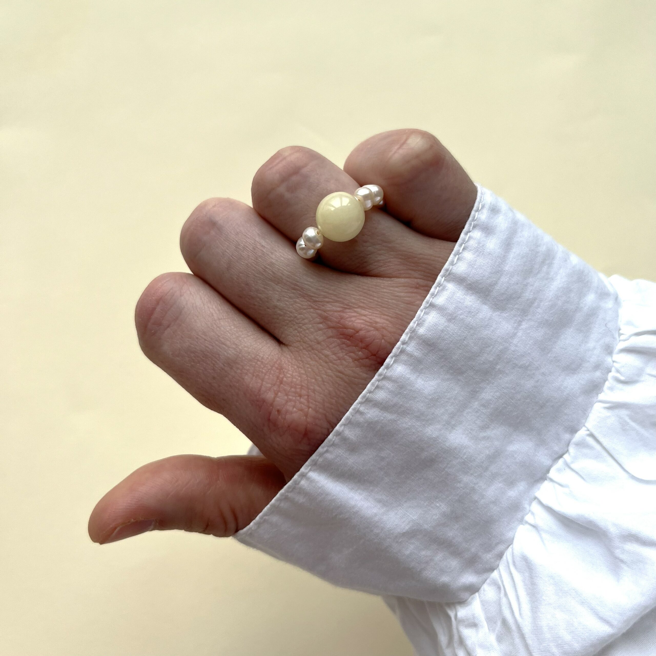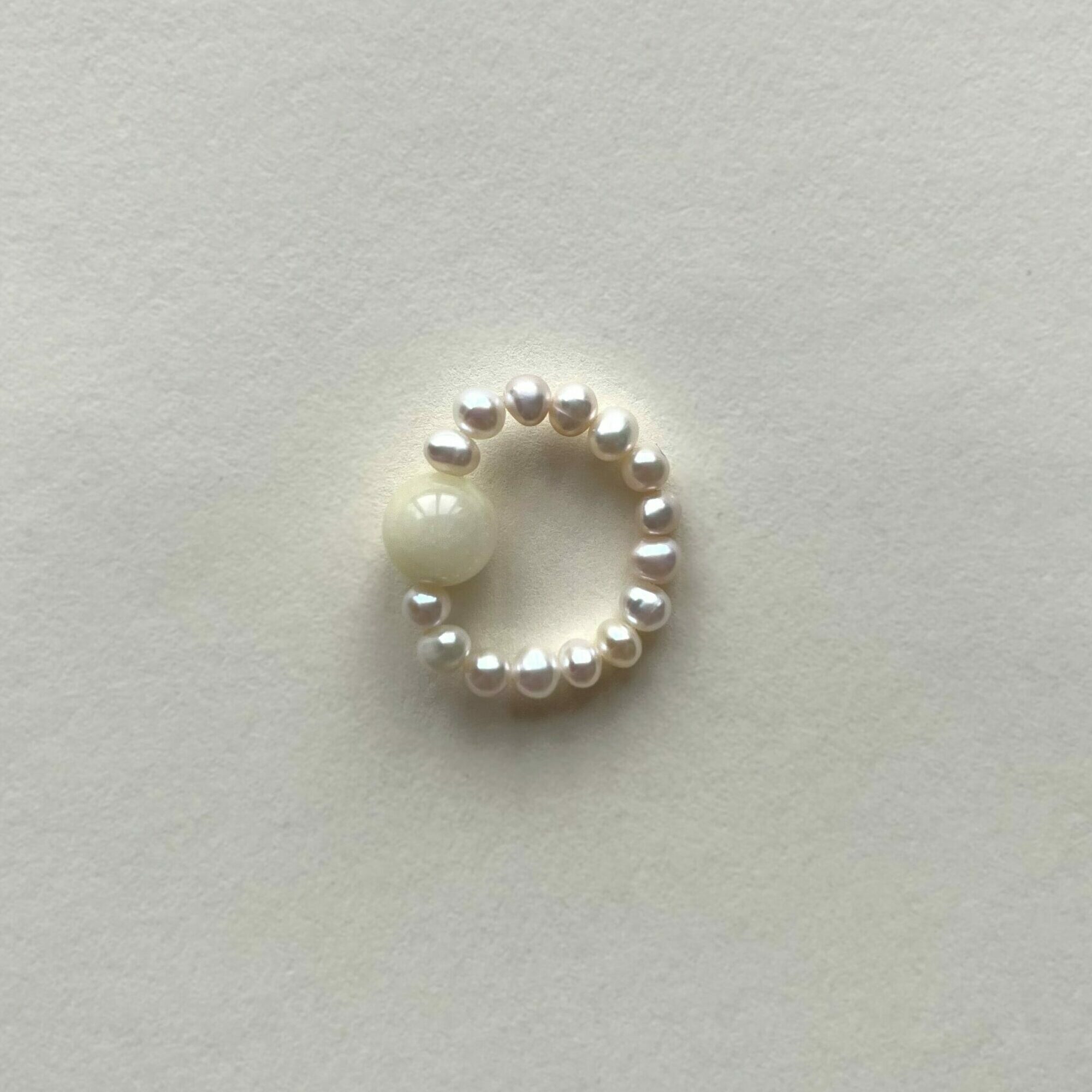 Minimalistyczny pierścionek z naturalnej perły i kulki z kamienia.
