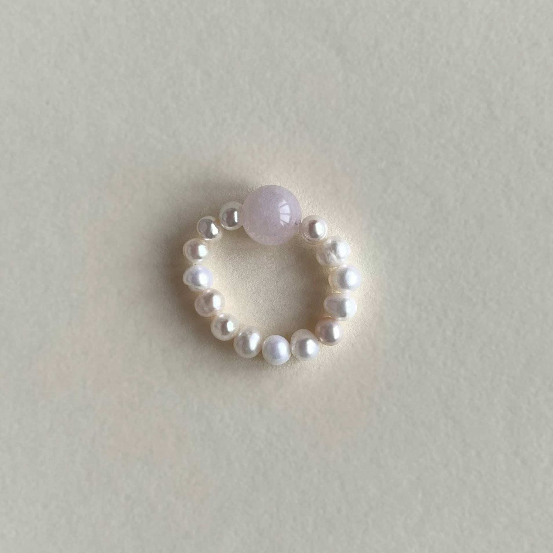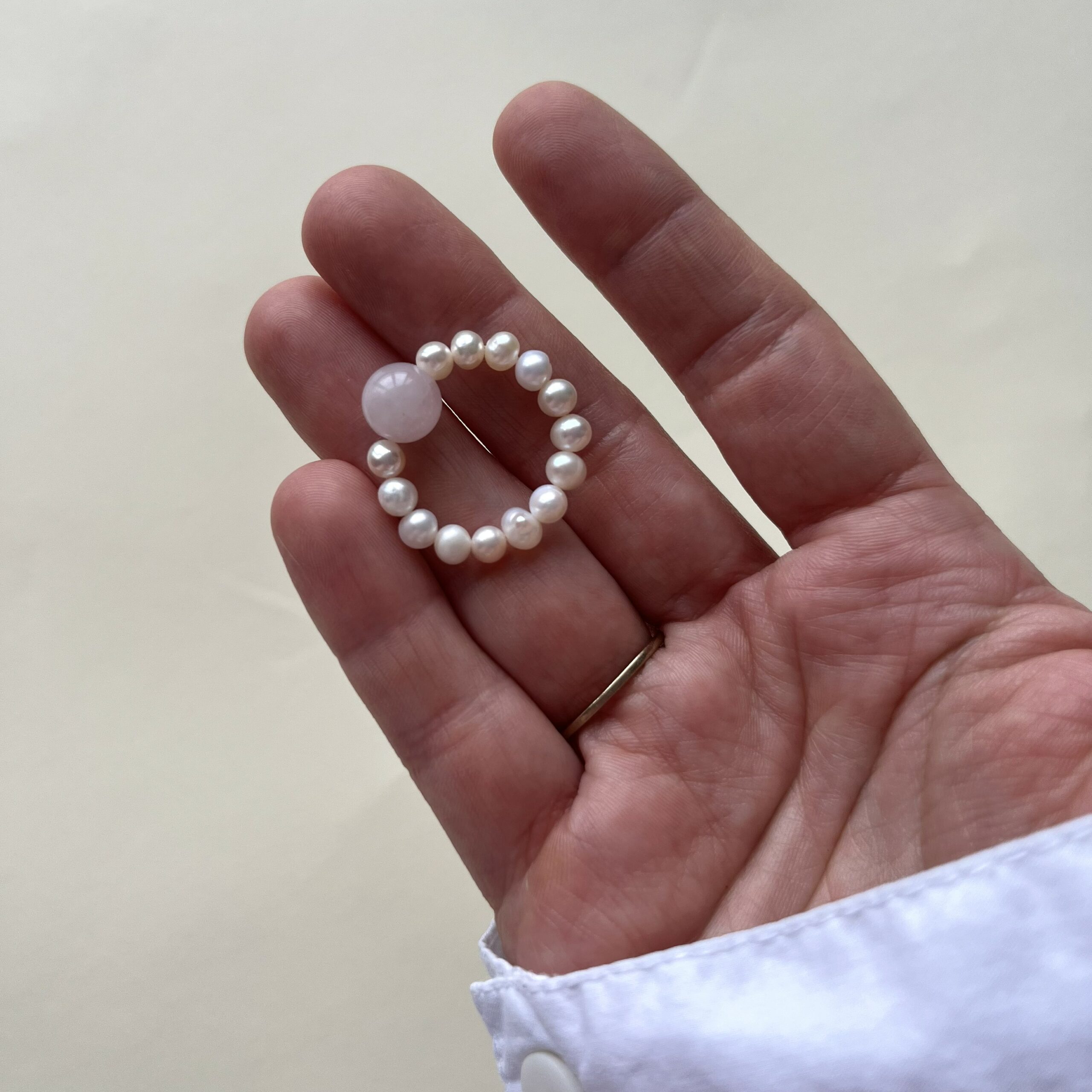 Minimalistyczny pierścionek z naturalnej perły i kulki z kamienia.